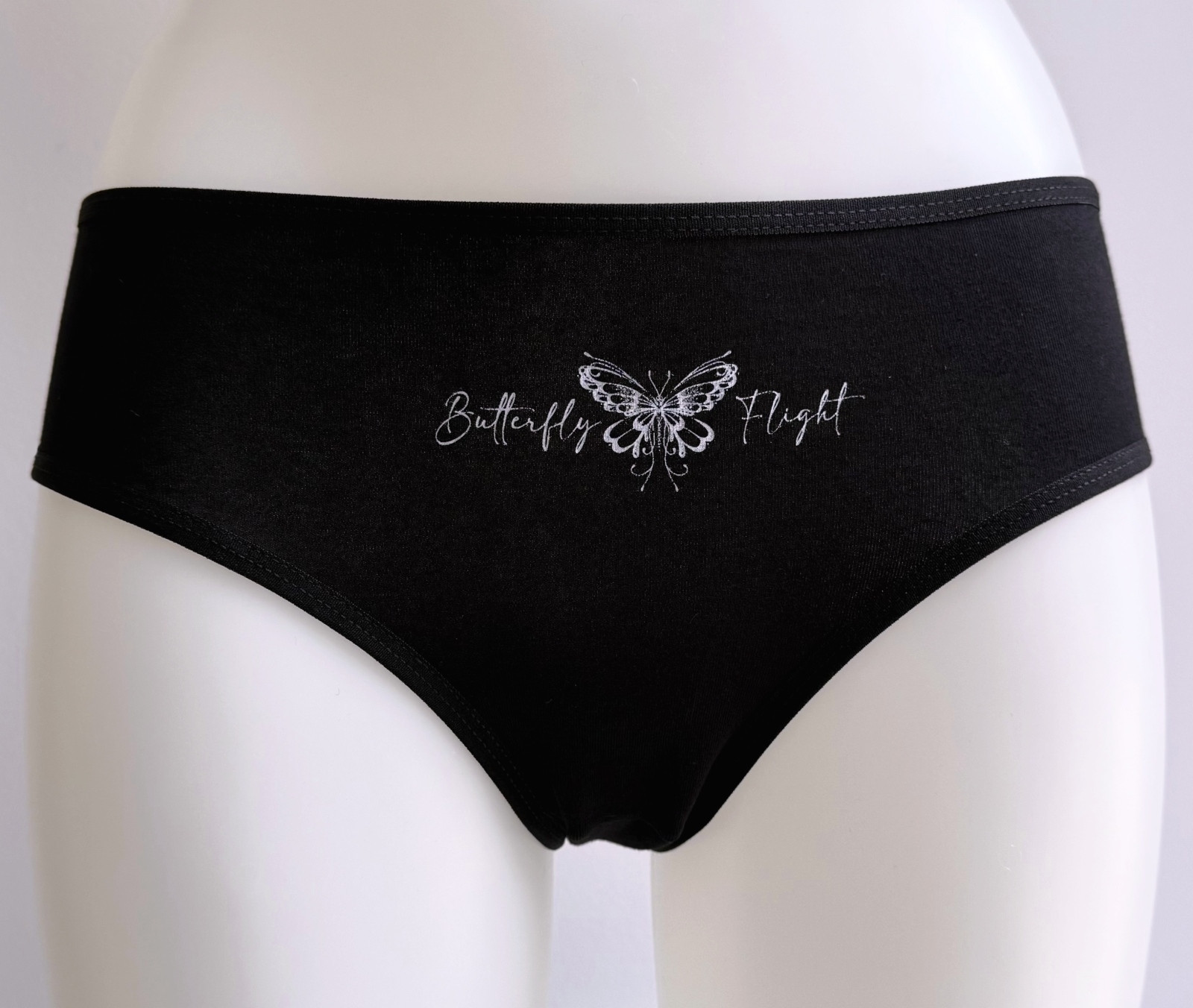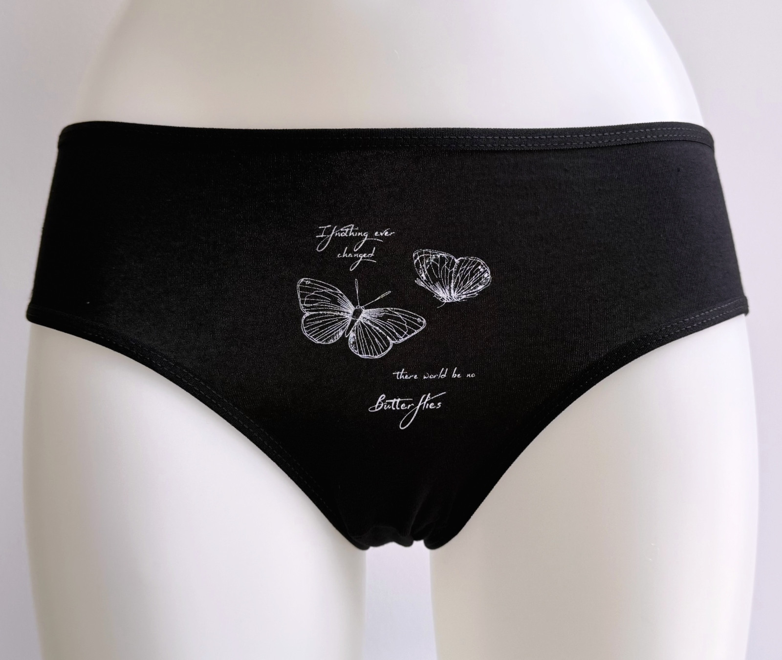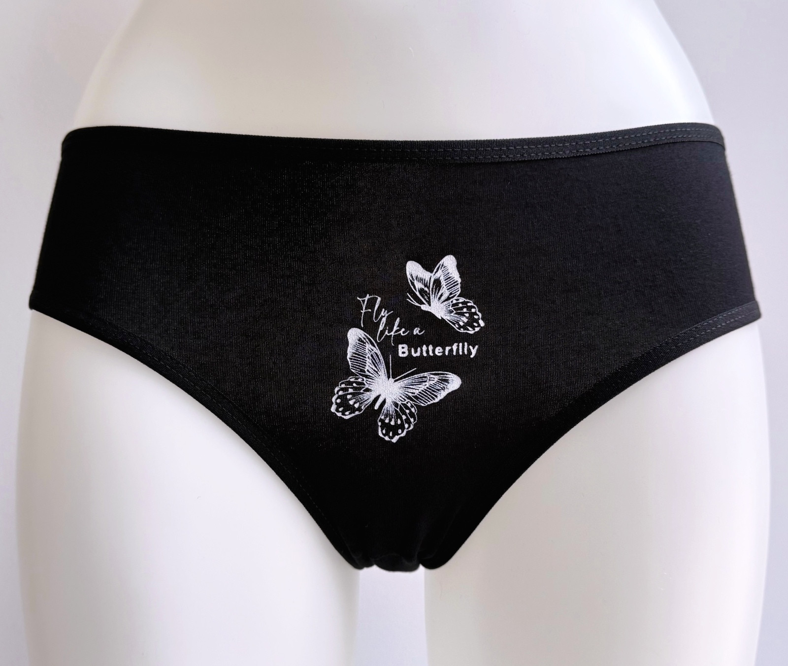 Dámské bavlněné kalhotky Butterfly. MIX obrázků. Pokud nějaký preferujete, popište do poznámky objednávky. Klasické kalhotky zdobené obrázkem motýla jsou pohodlným typem spodního prádla pro všechny příležitosti. Obzvláště oceníte materiálové složení - 95% bavlna a 5% elasten. Použitý materiál je příjemný a poddajný na dotek.