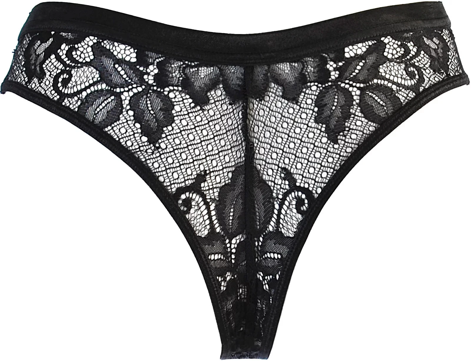 Černé krajkové kalhotky na béžovém tylu vás obklopí jemností materiálu, budete se cítit jako královna a dají průchod vašemu sex-appealu, tanga ve stylu braziliana mají vzadu zabudovanou krajku, takže se elegance prolíná s pohodlím, spolu s podprsenkou V-10771 tvoří krásný komplet, ve kterém budete nadšená.