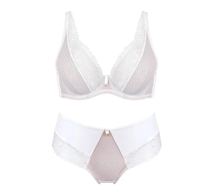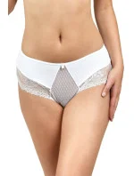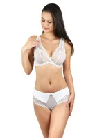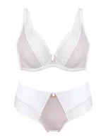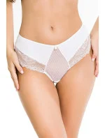 Přední díl kalhotek je ušitý z bílého jemného materiálu našitého na béžovou síťovinu. Boky a zadní díl modelu lemuje měkká krajka. Vrchní část tvoří jemné bílé mikrovlákno.
