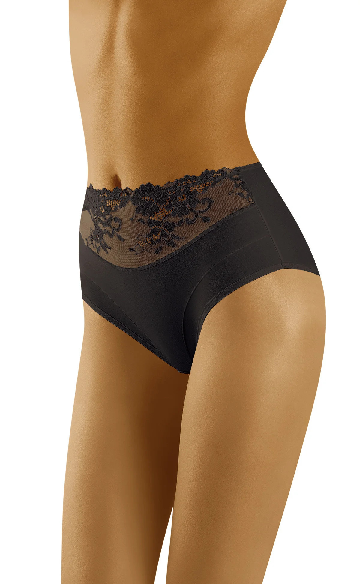 Vysoké, bavlněné kalhotky. V horní části zdobené krajkou. Pozadí hladké.