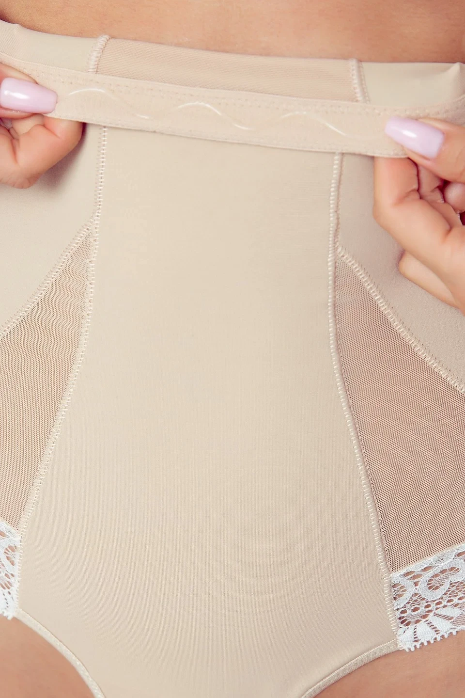 Kalhotky jsou vyrobené z hladkého mikrovlákna, zplošťují bříško a zeštíhlují pas. Nohavičky jsou olemované ažurovou krajkou. V pase modelu je na vnitřní straně silikonový pásek, díky kterému kalhotky při nošení nepadají, nesesouvají se a nerolují se. Model má bavlněnou vložku.