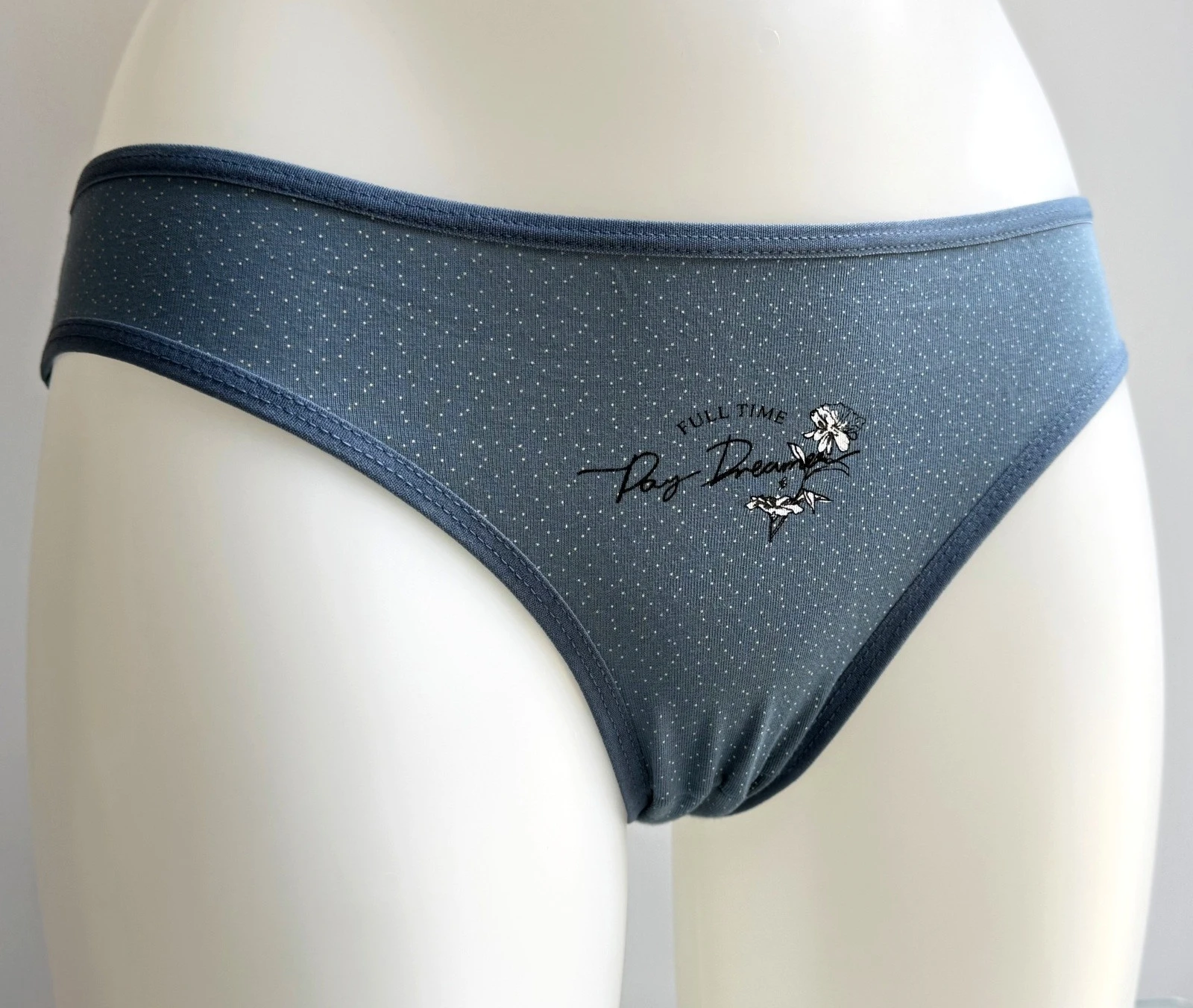 Dámské bavlněné kalhotky Elizabeth. Slušivé klasické kalhotky zdobené drobným nápisem a puntíky jsou pohodlným typem spodního prádla pro všechny příležitosti. Obzvláště oceníte materiálové složení - 95% bavlna a 5% elasten. Použitý materiál je příjemný a poddajný na dotek.