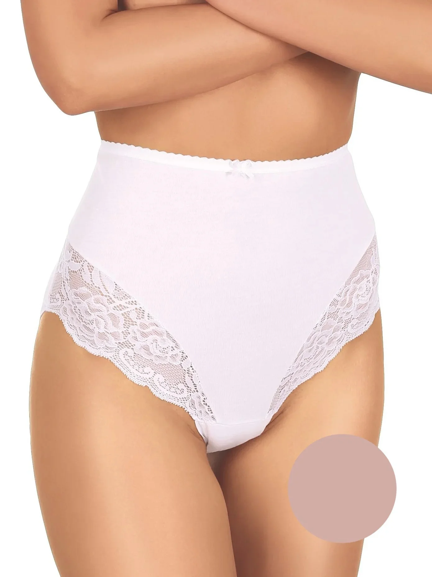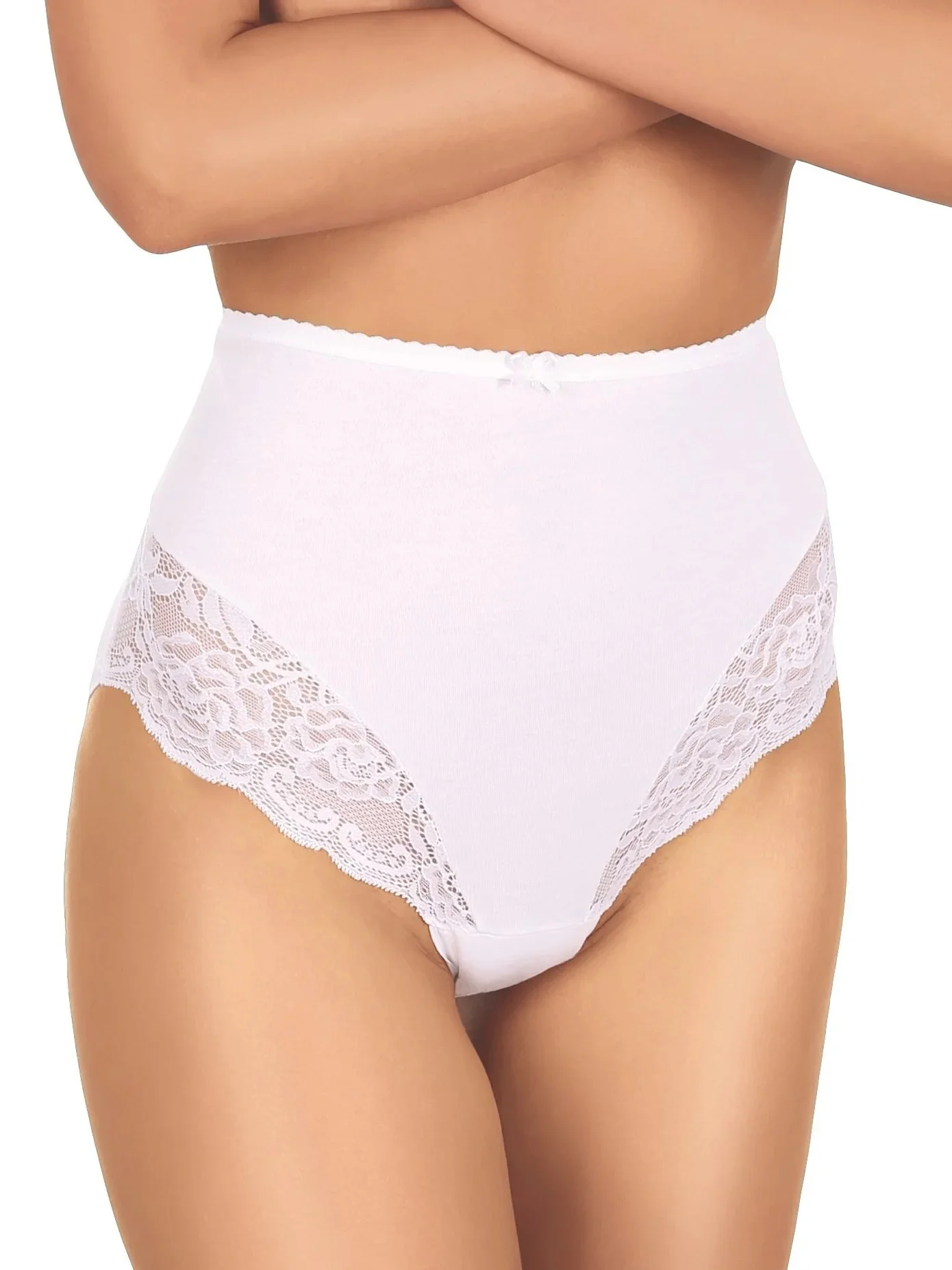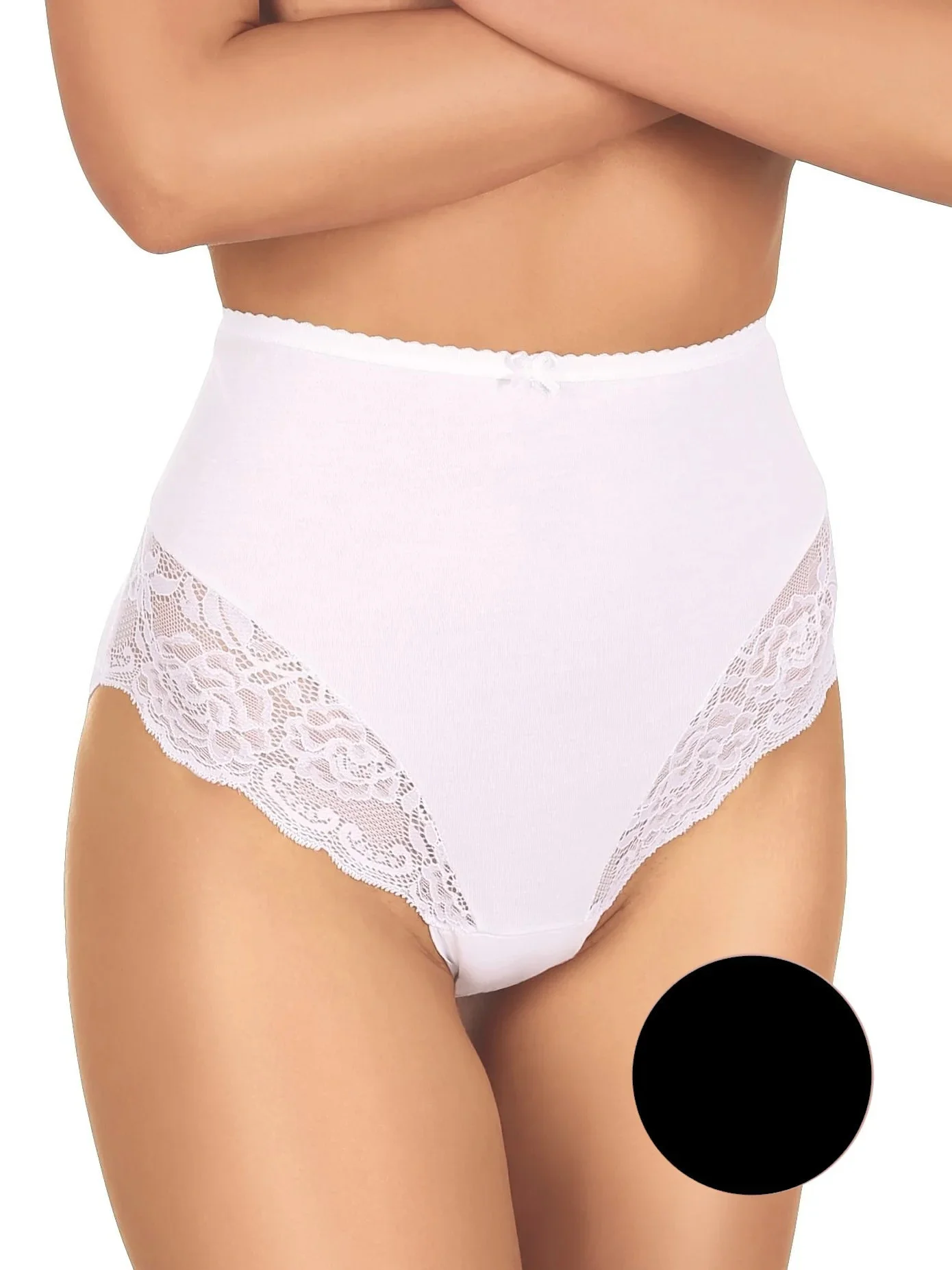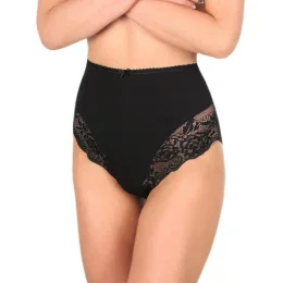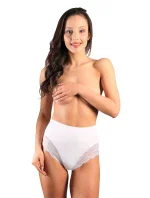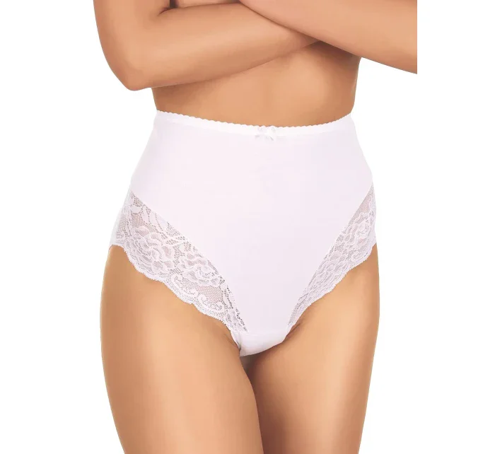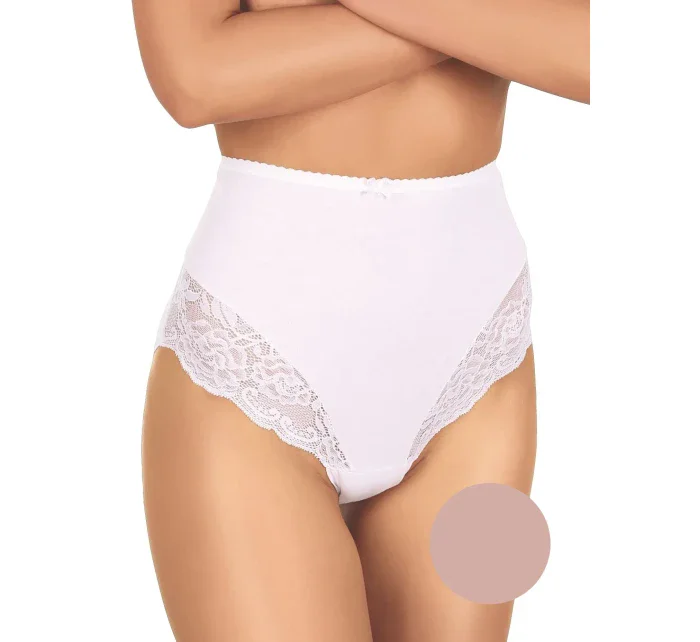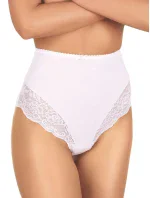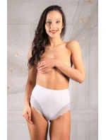 Kalhotky mají vysokou linii pasu a na bocích jsou plnější. Ve přední části modelu je krajkové lemování.