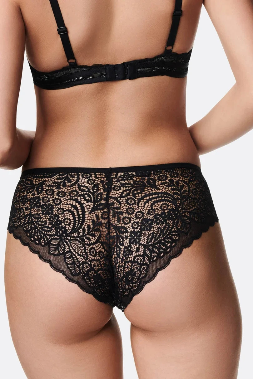 Smyslné krajkové kalhotky inspirované brazilskou krajkou v černé barvě se světle béžovým podkladem. Boky a zadní část jsou vyrobeny z na dotek příjemné ažurové krajky, zatímco přední část je navíc zpevněna hladkou látkou, takže se budete cítit krásně a zároveň pohodlně.