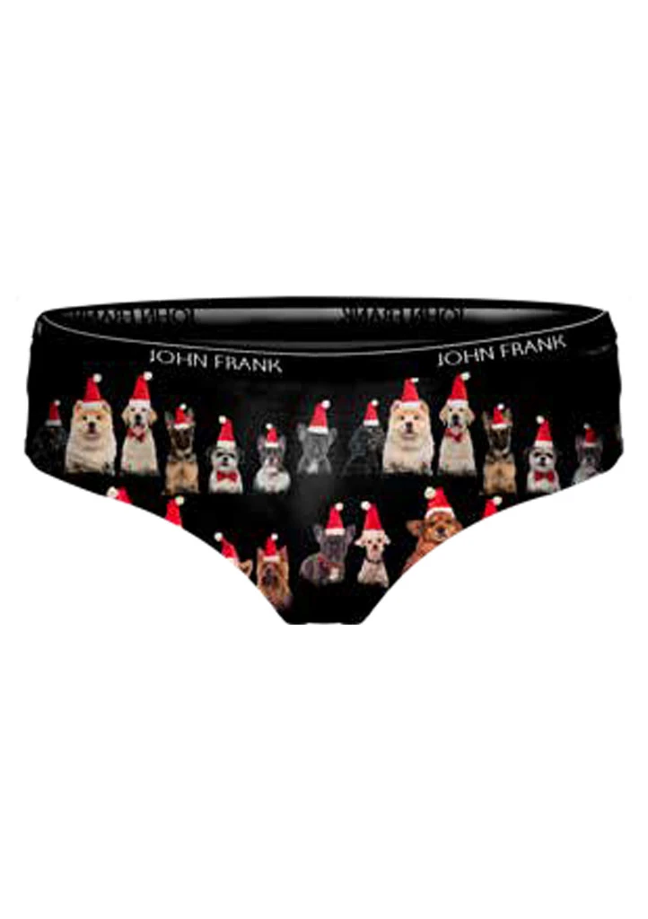 Dámské kalhotky John Frank potěší každou milovnici pejsků i veselých motivů. Černý základ zdobí roztomilí psi v červených vánočních čepičkách, což jim dodává sváteční a hravý vzhled. Jsou vyrobené z měkkého a elastického materiálu, který zajišťuje pohodlné nošení a perfektní přizpůsobení postavě. Kalhotky jsou navíc balené v elegantní dárkové krabičce s vánočním motivem, takže se skvěle hodí i jako originální dárek.