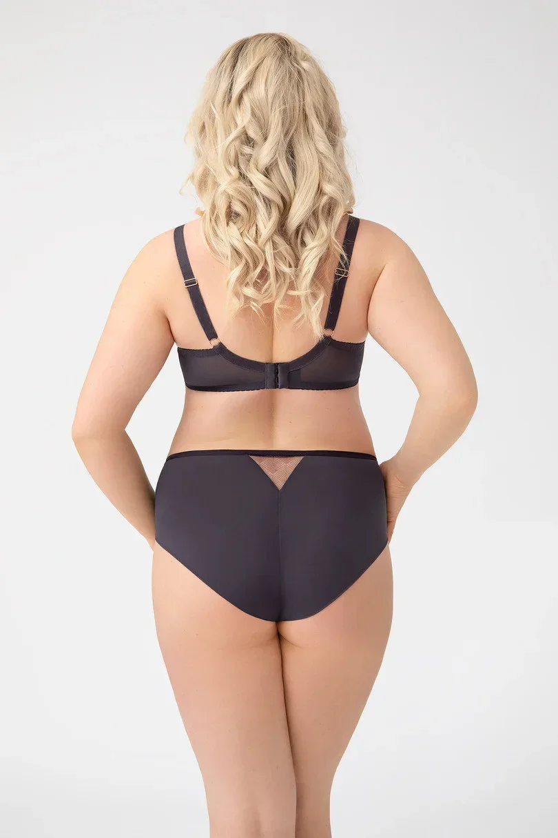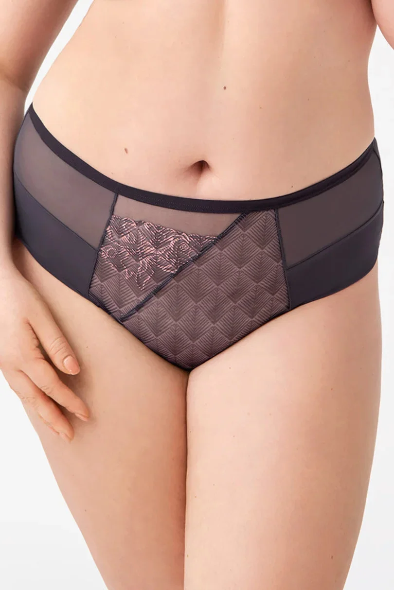 Přední díl kalhotek zdobí asymetrický prvek z potištěného tylu a z výšivky podšité hladkým tylem. Boky modelu jsou ušité z tylu. Nohavičky lemuje pružná páska.