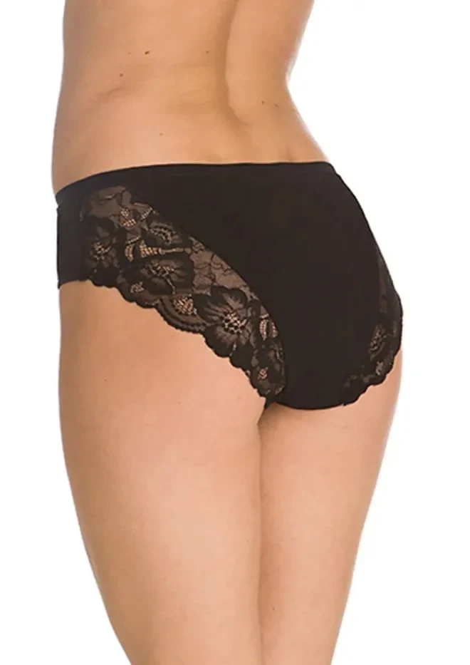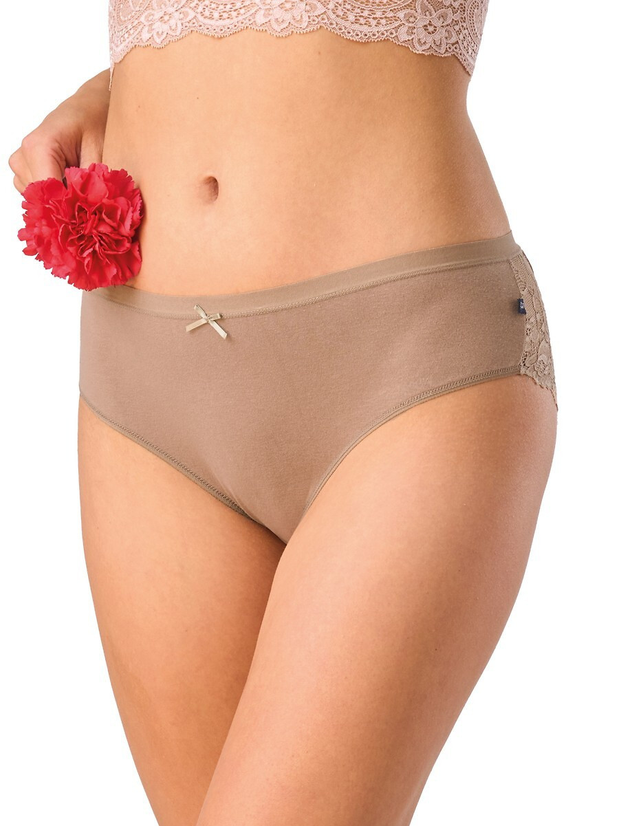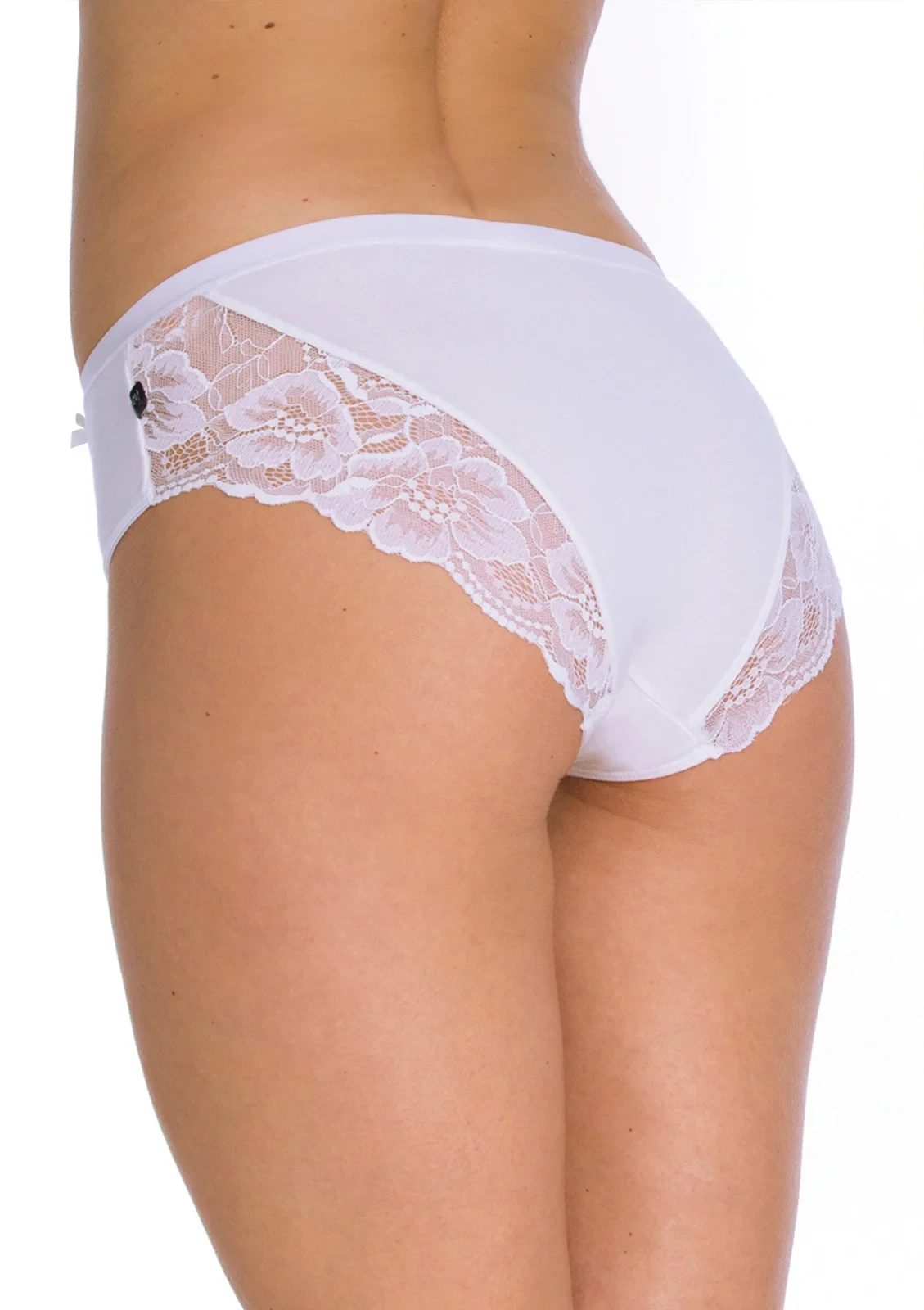Kalhotky mají vysoký pas a na bocích jsou plnější. Zadní díl modelu zdobí ažurová krajka s květinovým motivem. Kalhotky mají v pase pohodlnou plochou gumu.