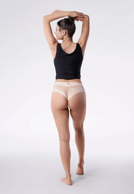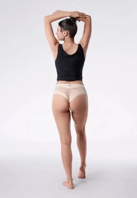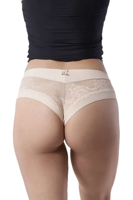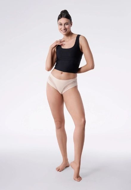 Dámské kalhotky Kiss Julimex - béžová barva - klasický střih - na bocích mají krajku s výšivkou - sed je zesílený látkou - na zadní straně decentní výstřih