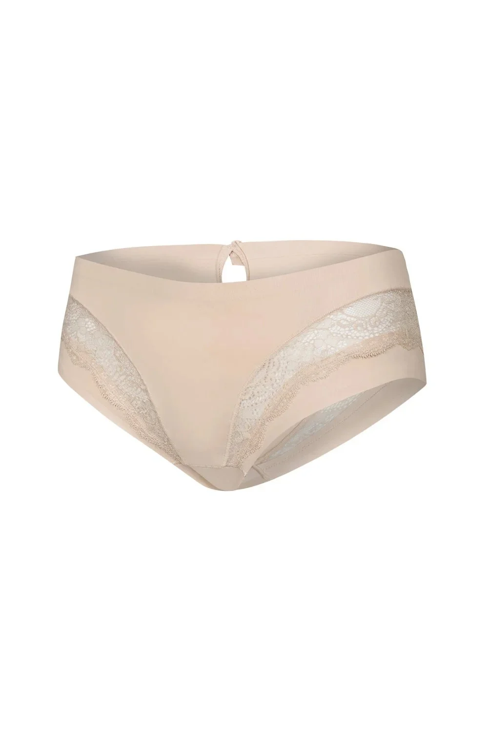 Dámské kalhotky Kiss Julimex - béžová barva - klasický střih - na bocích mají krajku s výšivkou - sed je zesílený látkou - na zadní straně decentní výstřih