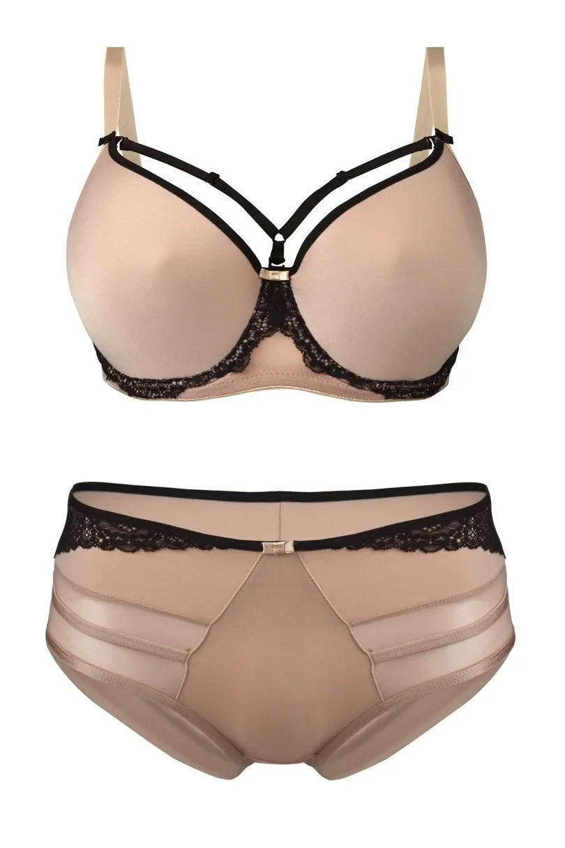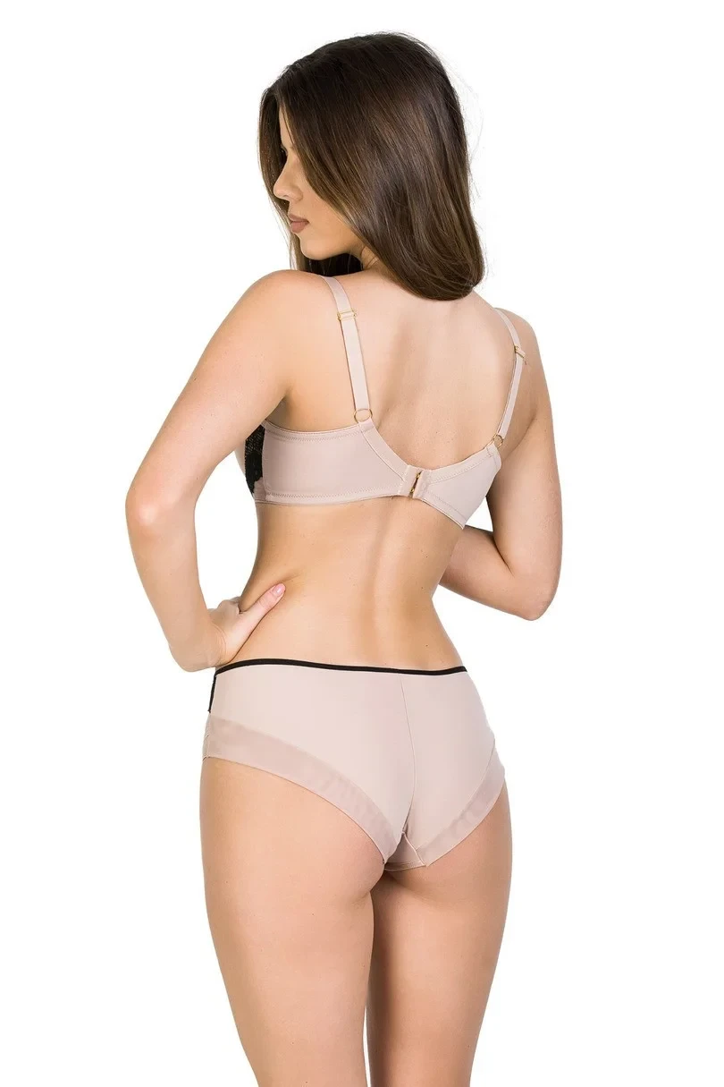 Kalhotky jsou vyrobené z mikrovlákna v barvě Mocca, boky zdobí pásky, zadní část zakončená mikrovláknem. Na horní straně zdobené krajkou v černé barvě.