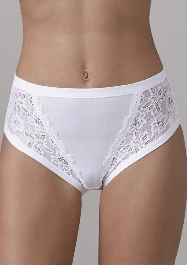 Dámské kalhotky vyššího střihu od značky Lovelygirl. Kalhotky jsou vyrobeny z bavlny a elastanu. Přední část je kombinována s elastickou krajkou s jemným květinovým vzorem. V balení jsou dvoje bílé kalhotky a jedny v červné barvě.