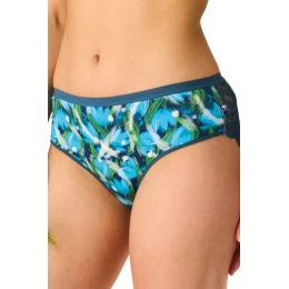 Dámské kalhotky klasického střihu, vyrobené z měkkého a elastického materiálu, který se dokonale přizpůsobí postavě. Výrazný květinový vzor v odstínech modré a zelené barvy dodává prádlu svěží, moderní charakter. Jemná krajka umístěná na boku dodává eleganci a lehkost, zároveň zachovává plný komfort při nošení. Ideální každodenní volba pro ženy, které rády kombinují pohodlí s originálním stylem.