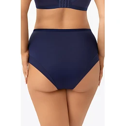 Dámské kalhotky v tmavě modré barvě s pohodlným, více postaveným střihem, který poskytuje dobré krytí a stabilní přilnutí k tělu. Hladký materiál v přední a zadní části zaručuje pohodlí a estetickou pozici na těle. Boky byly doplněny lehkými, poloprůhlednými tylovými vsadkami a ozdobnou krajkou s jemným motivem, která celku dodává eleganci a ženský charakter. Model se dobře osvědčuje při každodenním nošení a zároveň je atraktivním prvkem soupravy spodního prádla. Pečlivě zakončené okraje zvyšují pohodlí a diskrétnost pod oblečením.