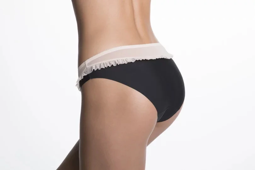 Kalhotky jsou vyrobené z pružné hladké tkaniny. Okraje jsou bezešvé, provedené pomocí technologie INVISIBLE LINE. Kalhotky jsou ozdobené vsadkou z transparentní síťoviny s volánkem.