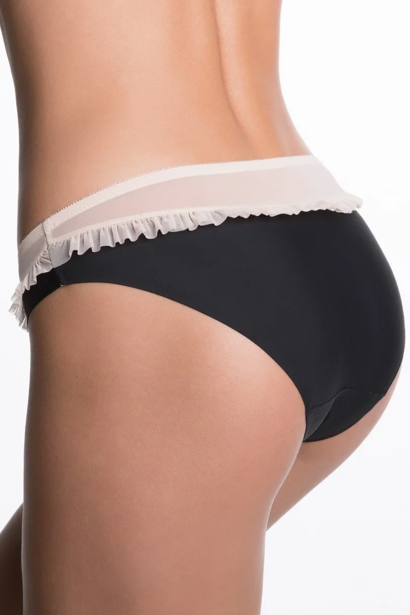 Kalhotky jsou vyrobené z pružné hladké tkaniny. Okraje jsou bezešvé, provedené pomocí technologie INVISIBLE LINE. Kalhotky jsou ozdobené vsadkou z transparentní síťoviny s volánkem.
