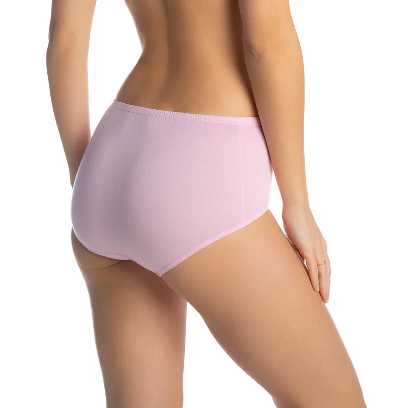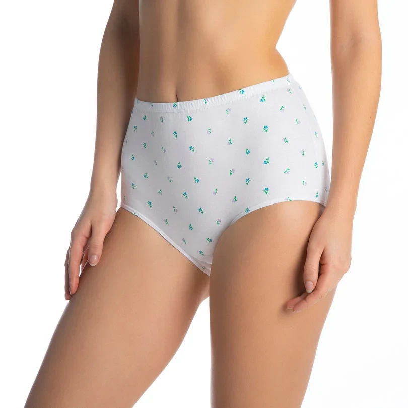 Dámské kalhotky klasického střihu bikini, ušité z přírodní bavlny. V balení je šest kusů kalhotek: bílé, bíle s květy, černé - mix.