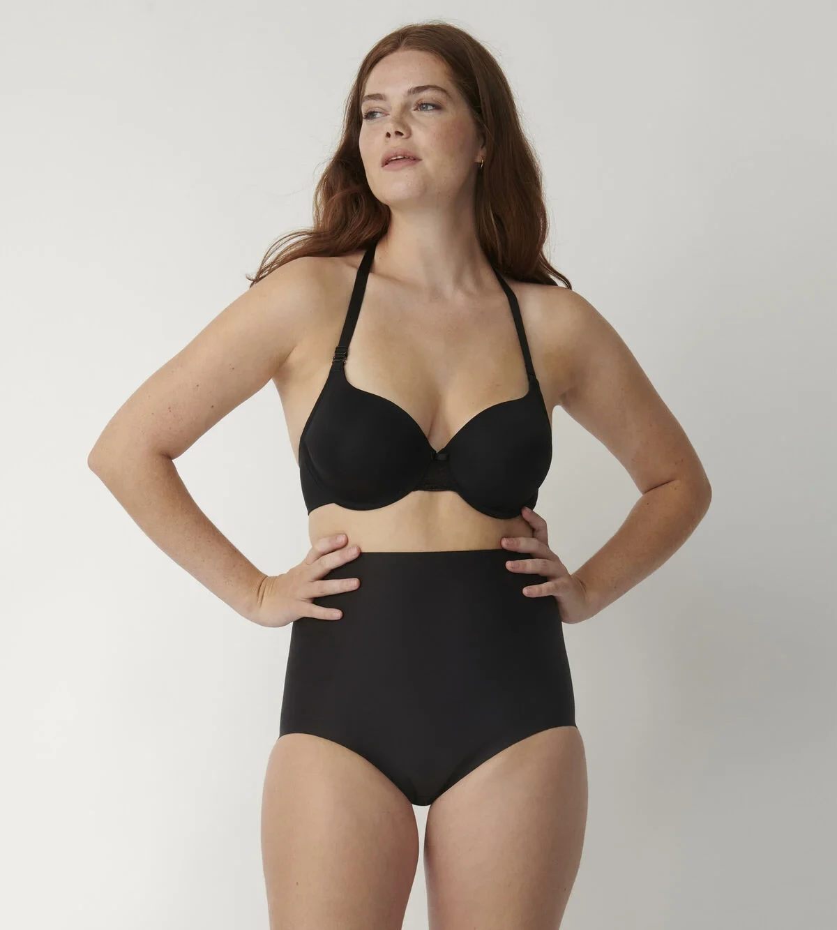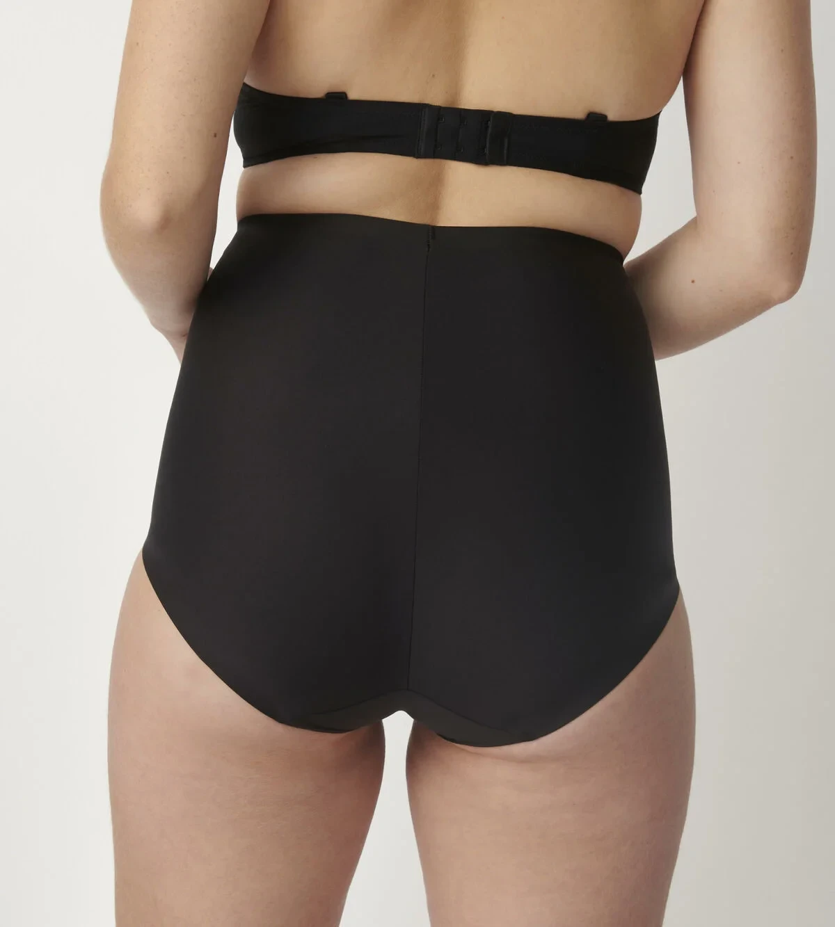 - Naše modelka má na sobě kalhotky s vysokým pasem ve velikosti M