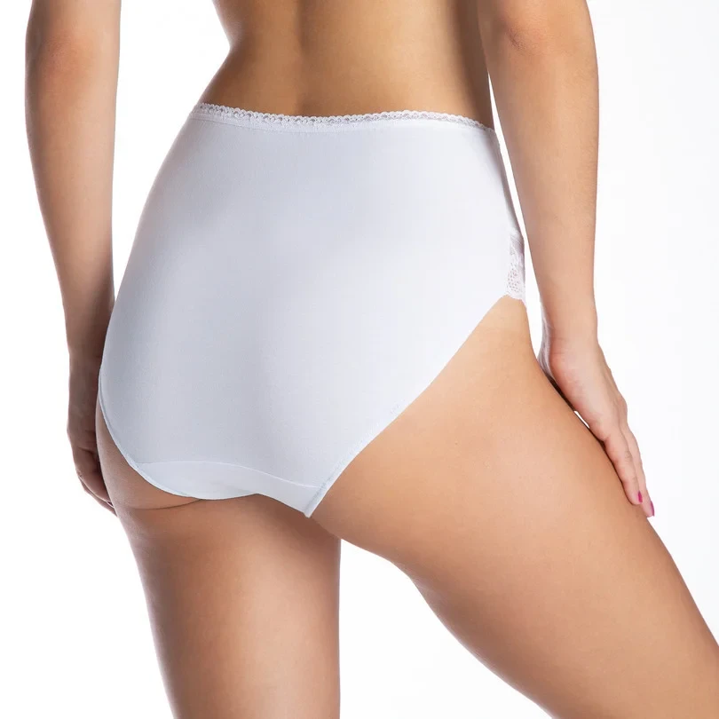 Dámské kalhotky s širokými boky a vysokým pasem. V balení dva kusy v bílé barvě s krajkovou všivkou. Jsou univerzální, modelují postavu a zakrývají celý zadeček. Ideální na každodenní nošení.