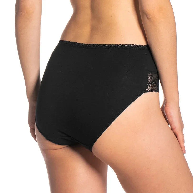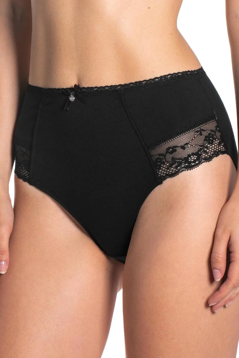 Kalhotky jsou balené po dvou kusech v černé barvě. Tento univerzální model je olemovaný ve přední části krajkou. Kalhotky jsou plné a mají vyšší střih, který částečně zakrývá bříško. Vzadu model důkladně zahaluje hýždě. Kalhotky pěkně tvarují postavu a jsou vhodné pro každodenní nošení.