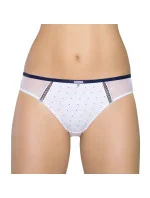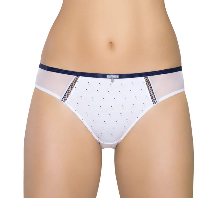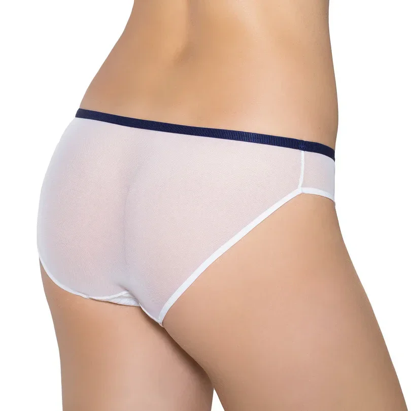 Dámské kalhotky typu bikiny s úzkými boky ušitými z poloprůsvitné síťky. 86% polyamid, 14% elastan.