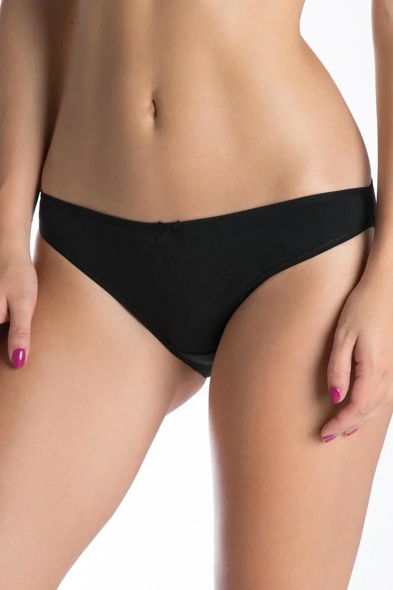 Dámské kalhotky typu mini bikiny. V sadě po 3 kusech v černé barvě. V pase je pohodlná guma a ozdobná mašlička. Mají klasický střih, středně vysoký pas a širší boky. Velice pohodlné.