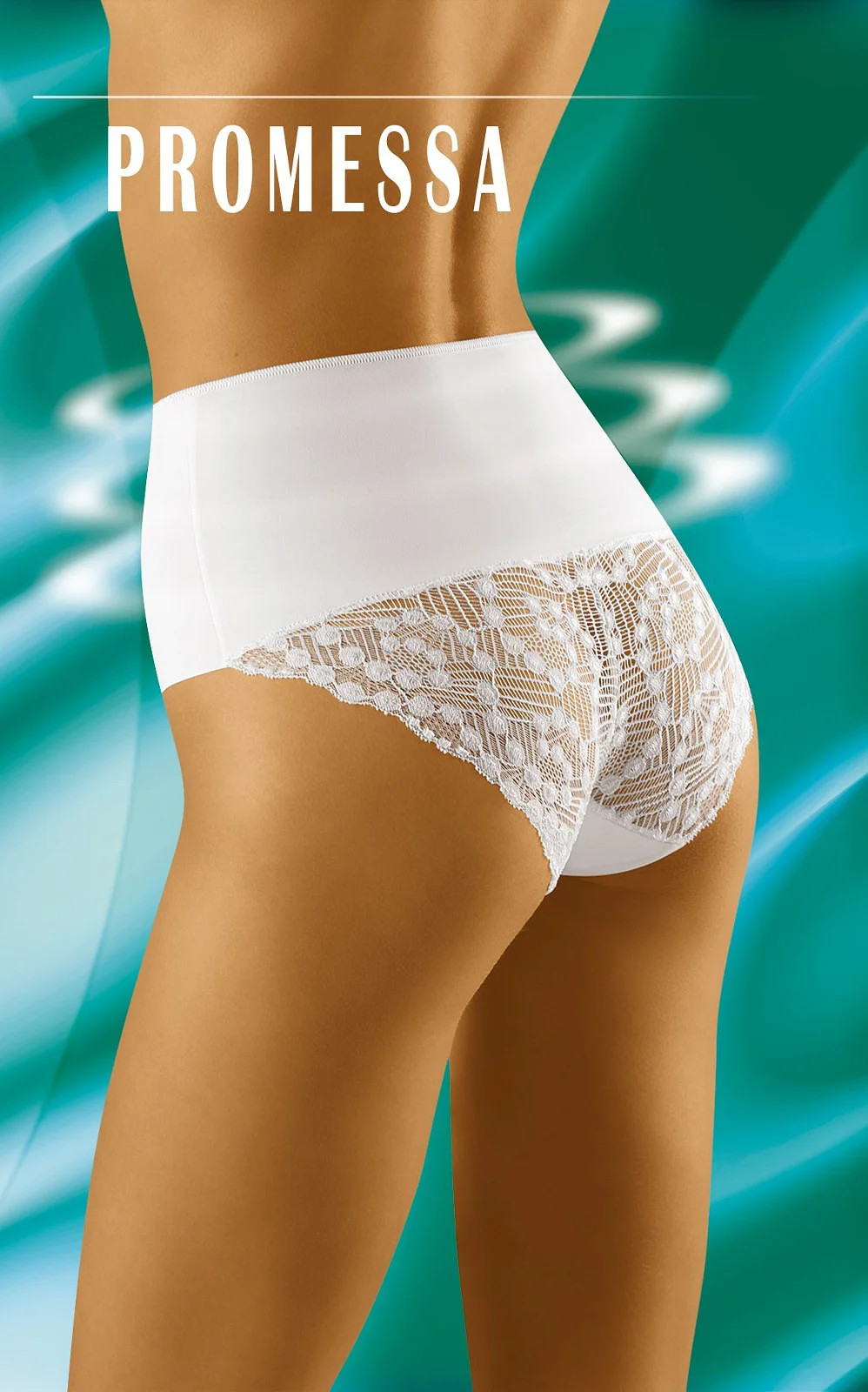 Kalhotky pěkně obepínají bříško a zvýrazňují linii pasu. Nohavičky jsou ve přední části modelu střižené laserem. Zadní díl kalhotek zdobí efektní ažurová krajka.