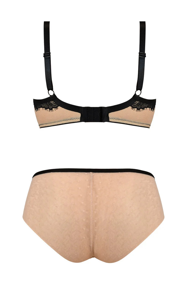 Zadní díl kalhotek je plnější a je vyrobený ze síťoviny s ozdobnými puntíky. Přední díl modelu tvoří béžová puntíkovaná síťovina a černá krajka. V pase je černá lemovka s béžovou mašličkou.