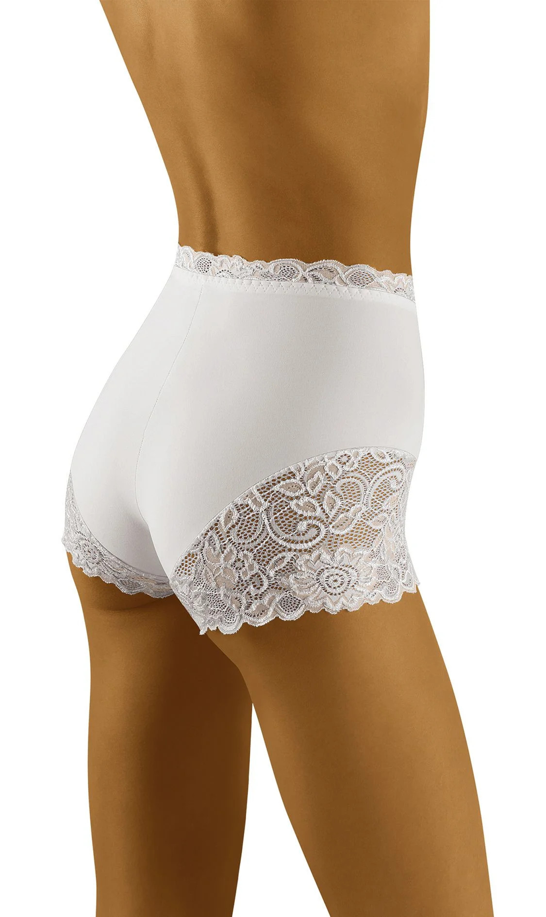 Směs ženskosti a pohodlí. Vyšší střih, krajkové nohavice, krajkový lem v pase... Tyto šortky byly vytvořeny pro ženy, které ocení spodní prádlo s vyšším, lépe stavěným střihem. Jsou pohodlné a praktické, jemně tvarují postavu. Přední a zadní strana - hladká. Složení: 87 % polyamid, 13 % elastan.