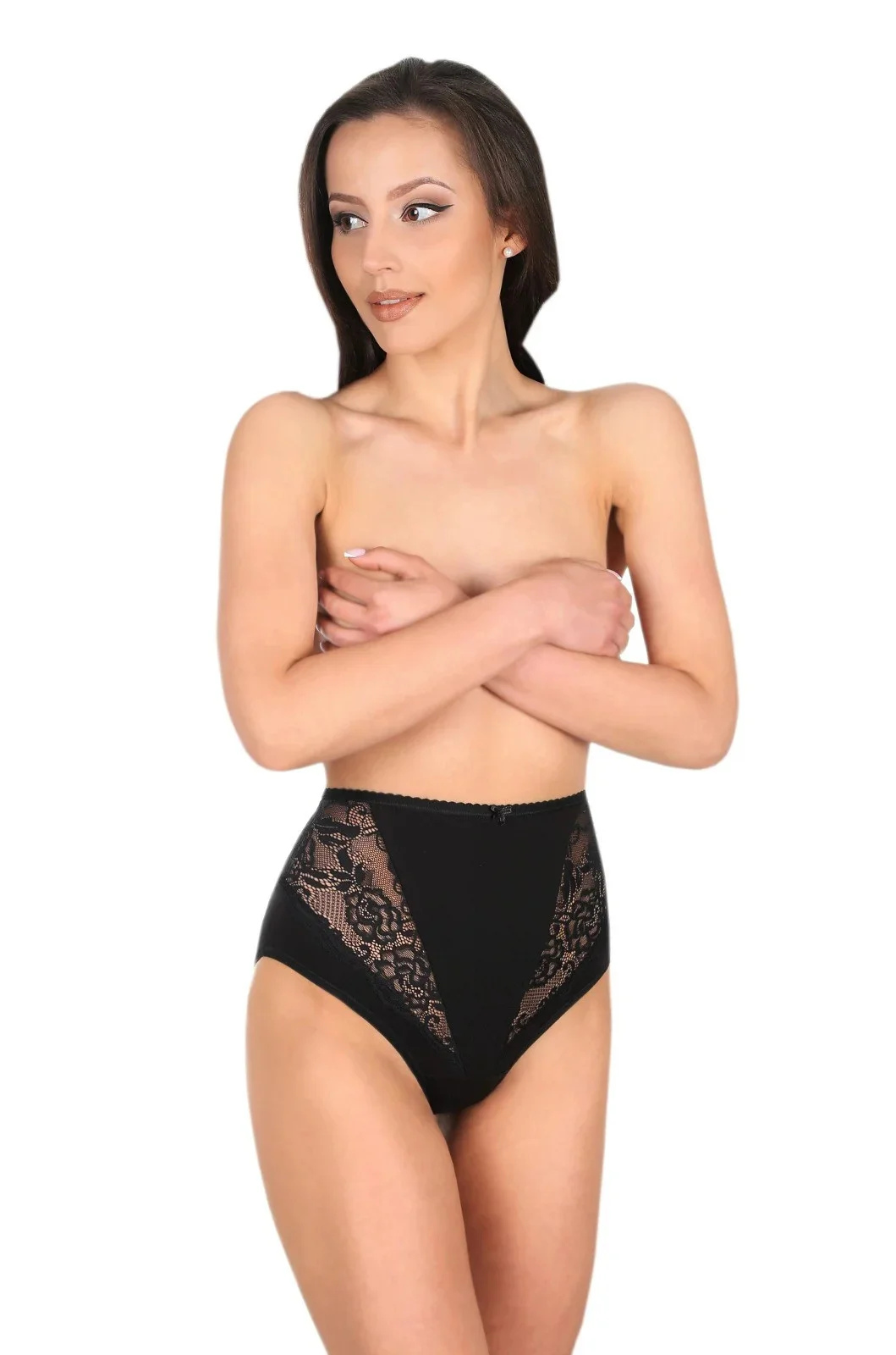 Kalhotky mají vysoký střih, vysokou linii pasu a plné boky. Efektní přední díl zdobí krajkové vsadky s květinovým motivem.