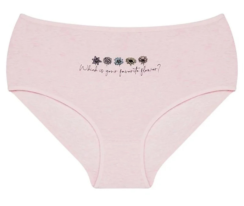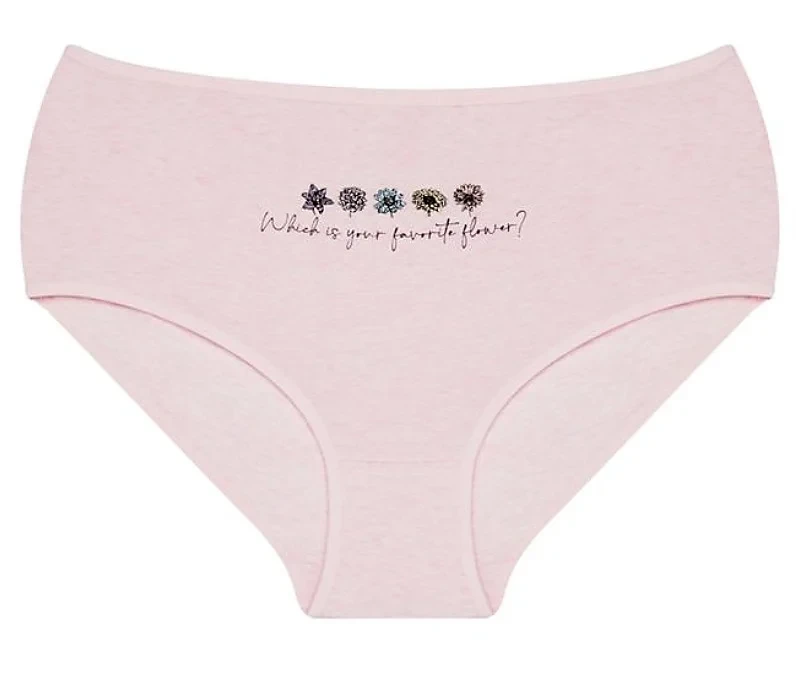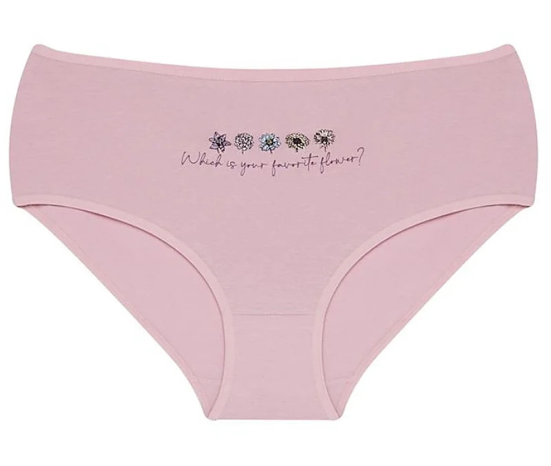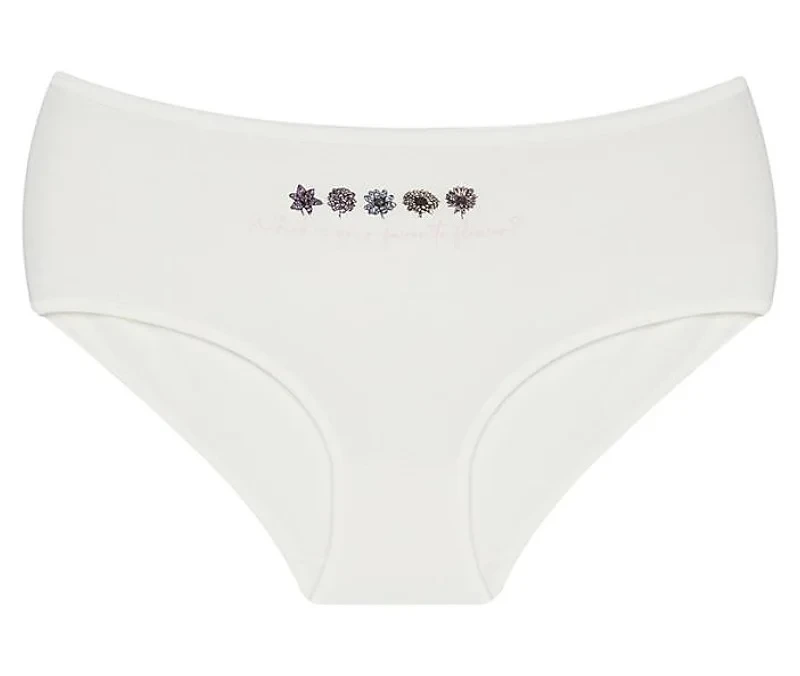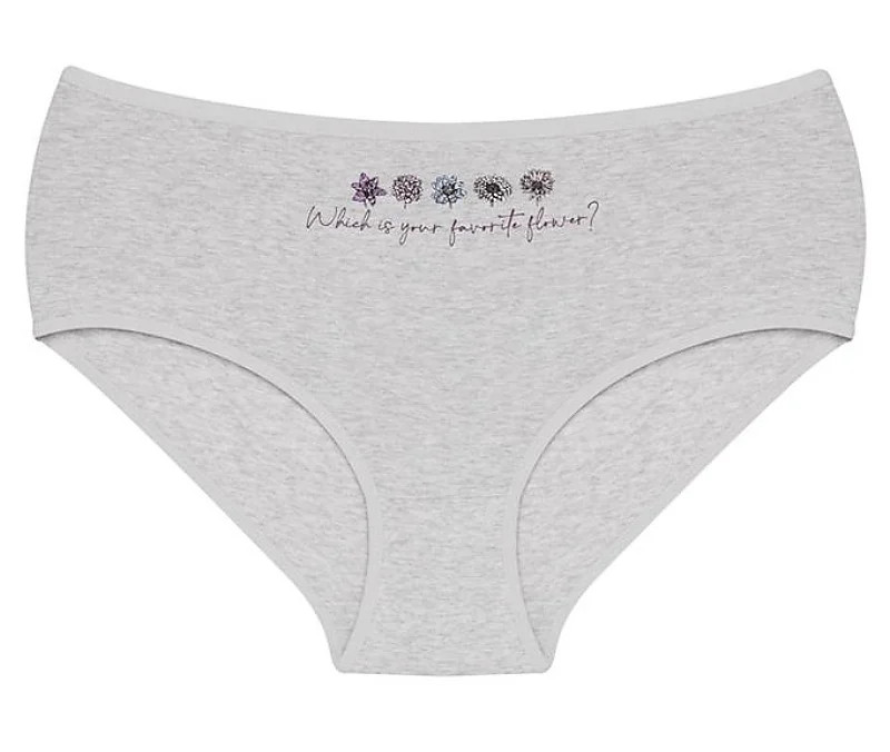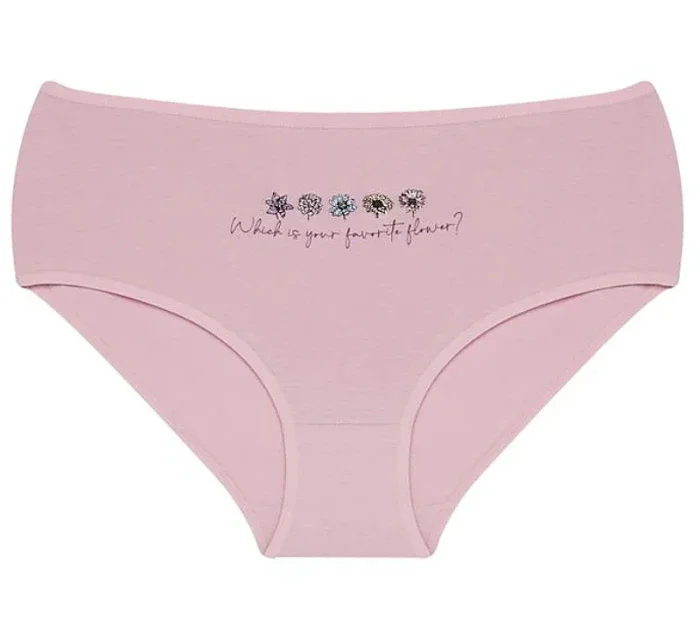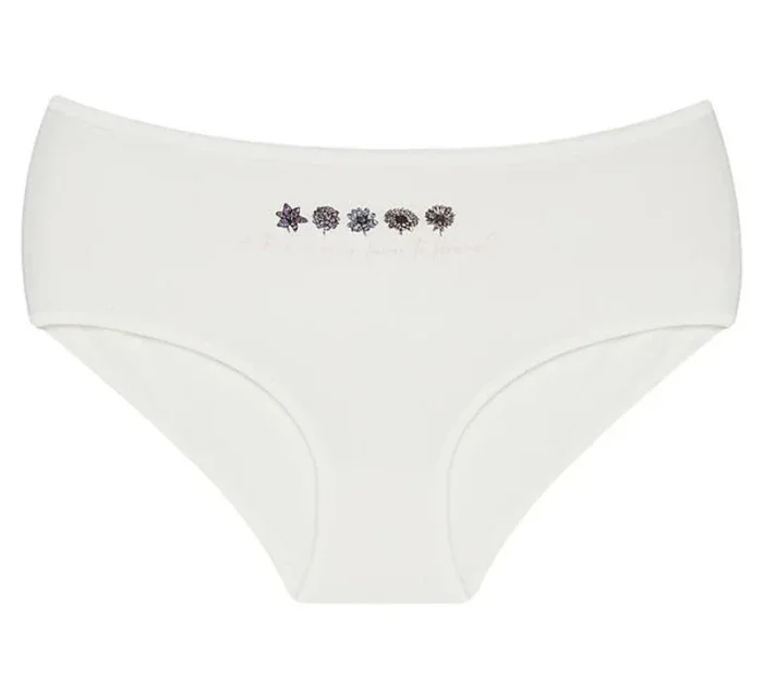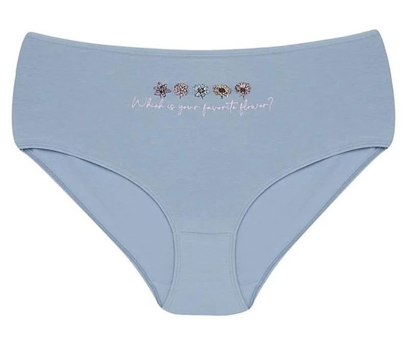 Dámske nohavičky Mirka. Dámske nohavičky klasického strihu. Nohavičky sú ozdobené potlačou kvetín a drobným nápisom. Použitý materiál je príjemný a poddajný na dotyk.