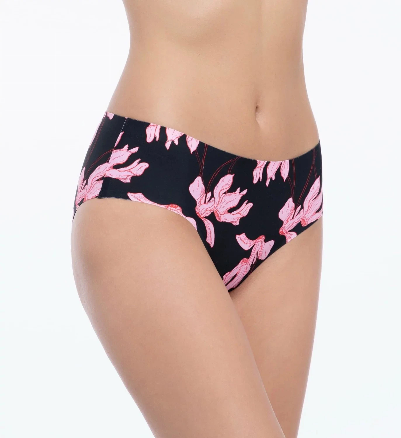 Kalhotky jsou ozdobené květinovým potiskem. Model je bezešvý, je střižený laserem a nerýsuje se ani pod vypasovaným oblečením.