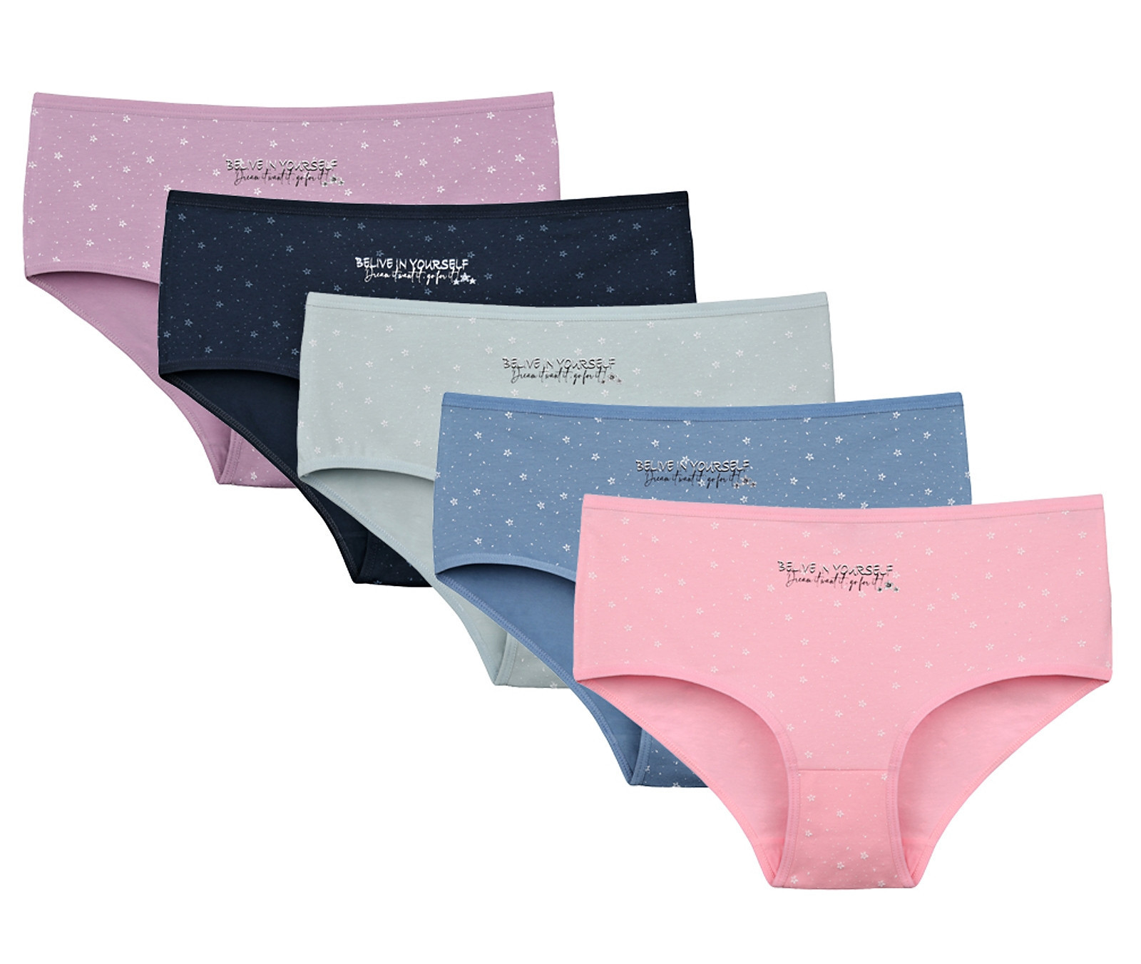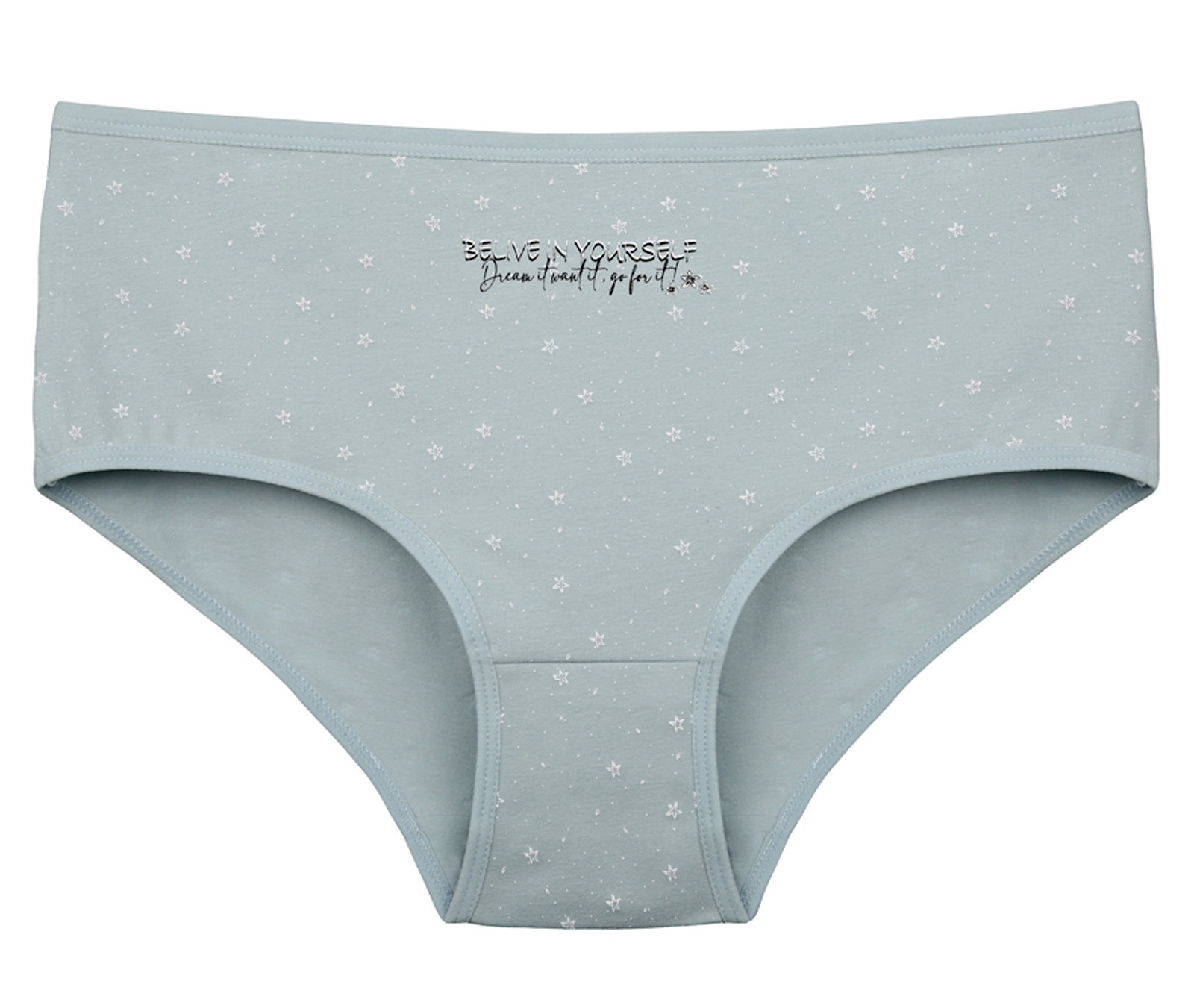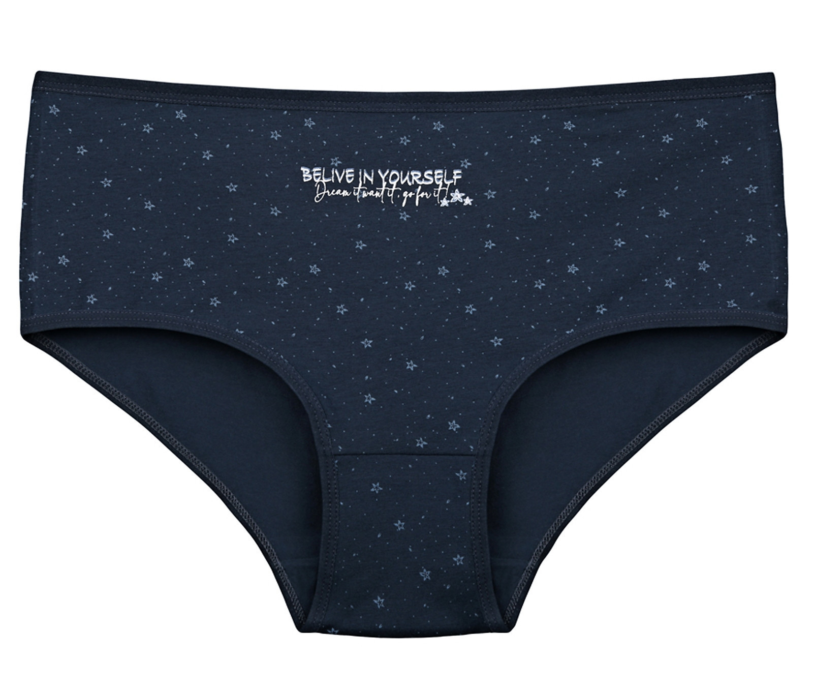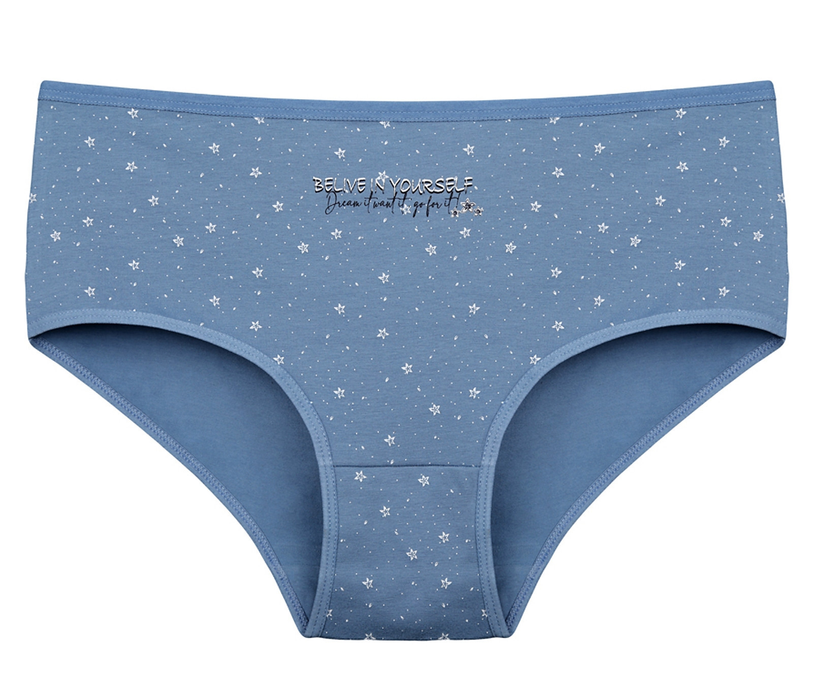Dámské bavlněné kalhotky Hvězdy. Slušivé klasické vyšší kalhotky s potiskem hvězdiček jsou pohodlným typem spodního prádla pro všechny příležitosti. Obzvláště oceníte materiálové složení - 95% bavlna a 5% elasten. Použitý materiál je příjemný a poddajný na dotek.