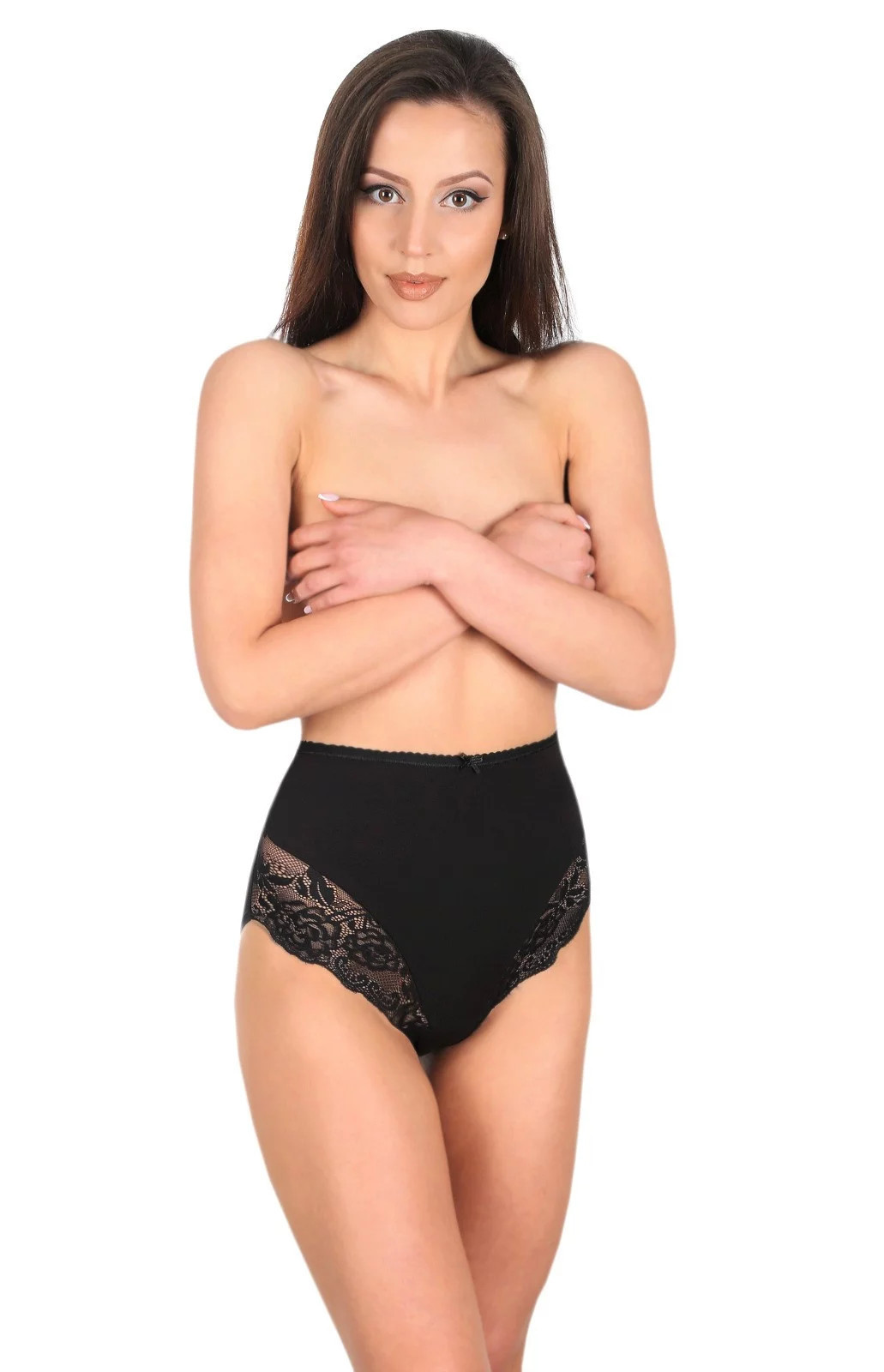 Kalhotky mají vysokou linii pasu a na bocích jsou plnější. Ve přední části modelu je krajkové lemování.