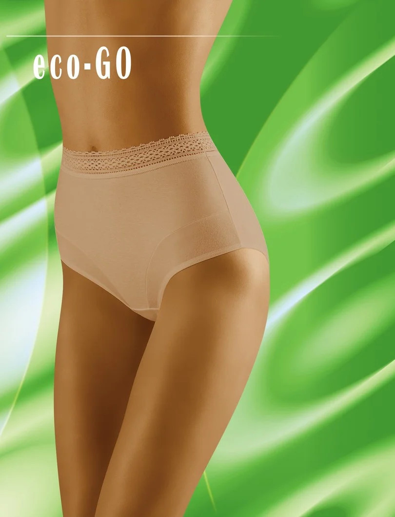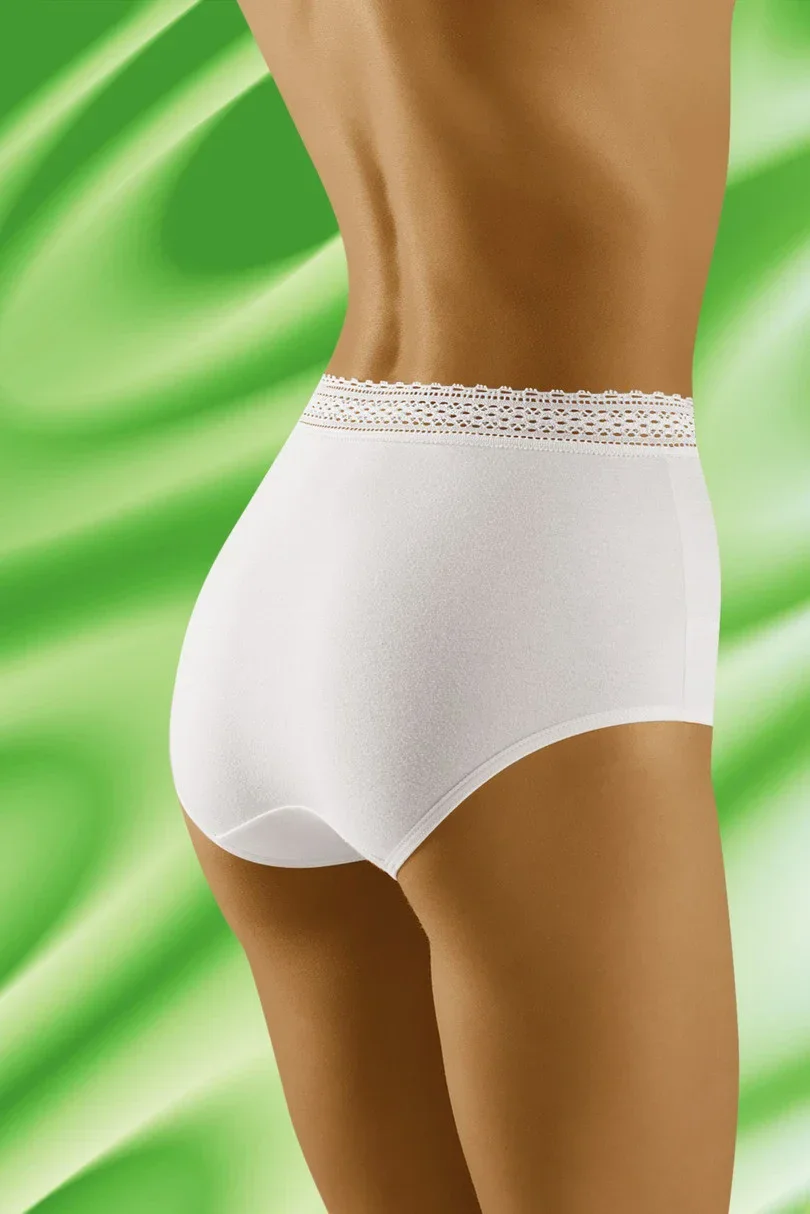 Dámské kalhotky z kvalitní bavlny. Vrch zdobí krajkový pruh. Jsou vyšší, zpevněné v bocích. Pozadí je hladké. Velikosti:M, L, XL, XXL, Barvy: bílá, béžová, černá