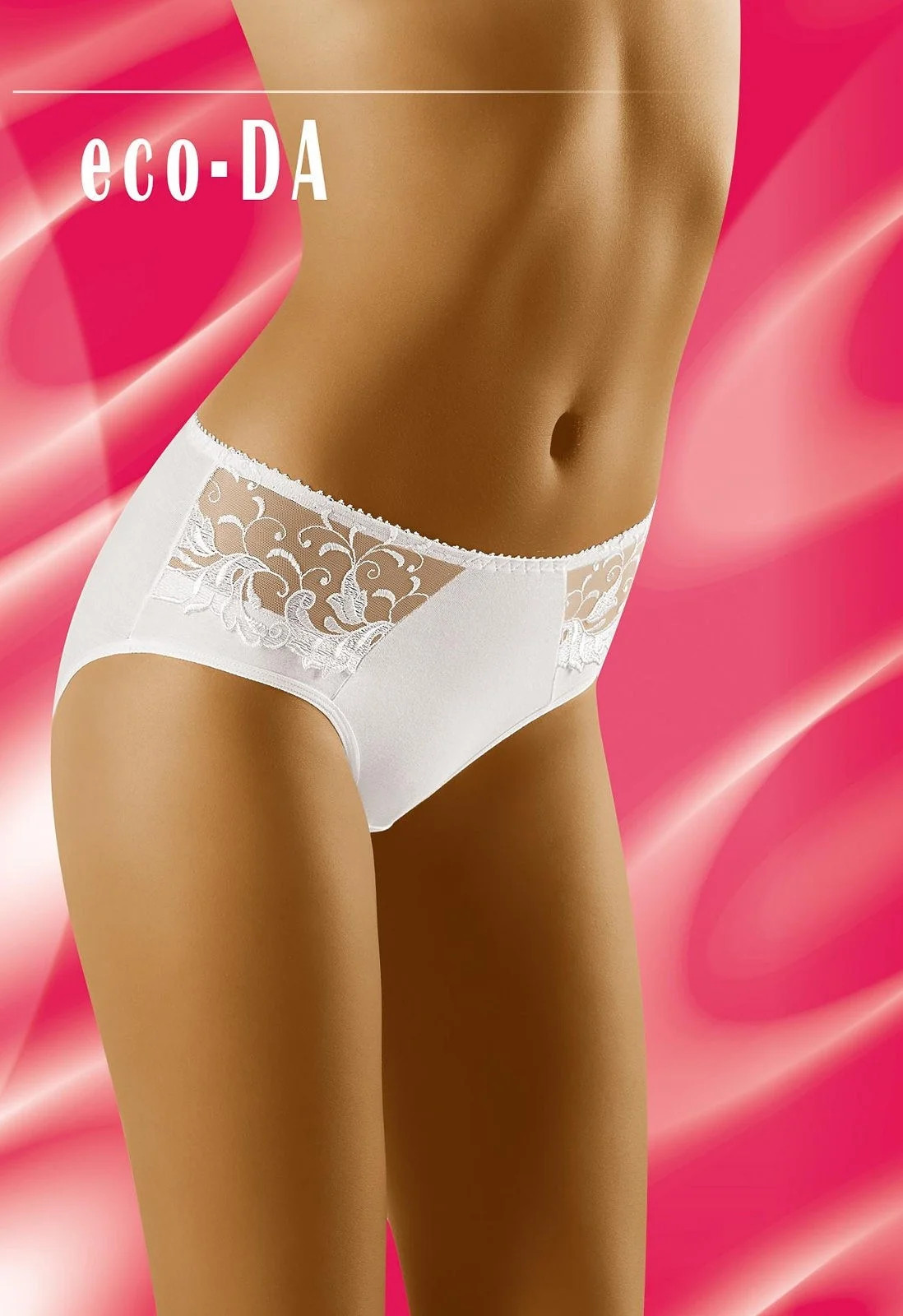 Přední díl modelu zdobí vsadky z jemného tylu s pěknou výšivkou s květinovým motivem. Kalhotky jsou vysoké a na bocích plnější. Zadní díl modelu je hladký, jednolitý.