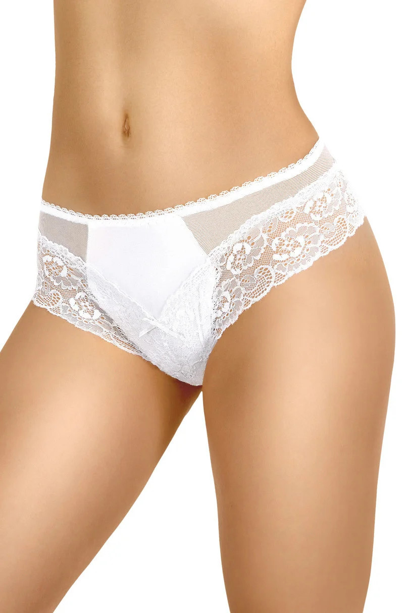 Dámské krajkové kalhotky. Na přední i zadní straně jsou všivky ze síťky a efektní, květované krajky.