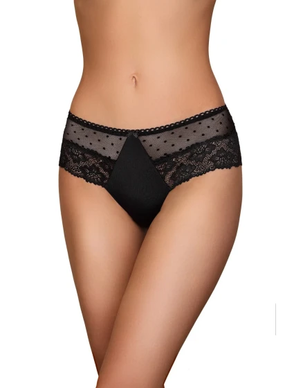 Kalhotky jsou ušité z drobně puntíkované síťoviny. Nohavičky jsou obšité krajkou.