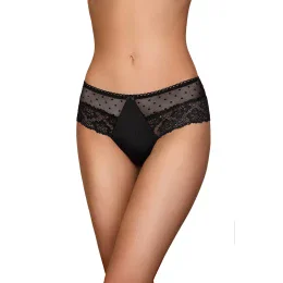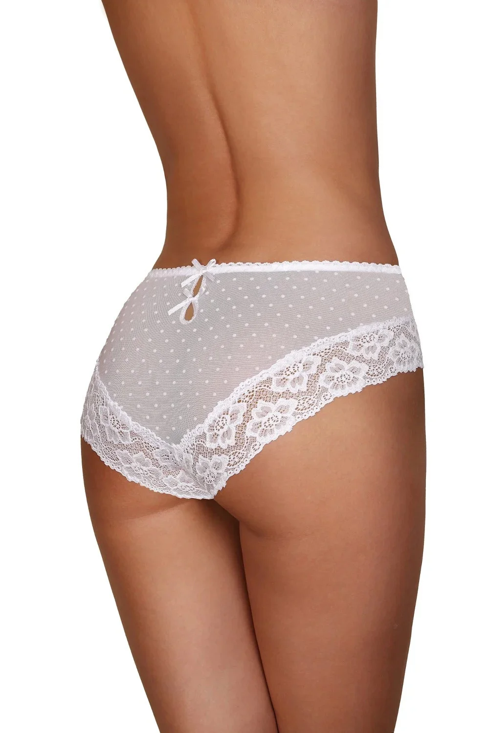 Kalhotky jsou ušité z drobně puntíkované síťoviny. Nohavičky jsou obšité krajkou.