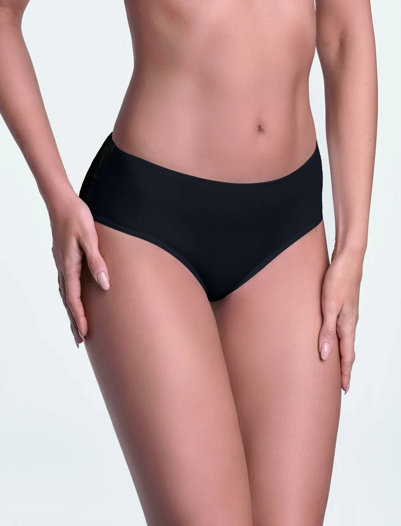 Dámske nohavičky hladké a nepriehľadné vpredu a zvodne priesvitné na zadočku.Zadná časť zo sieťovaného tylu a čipky.