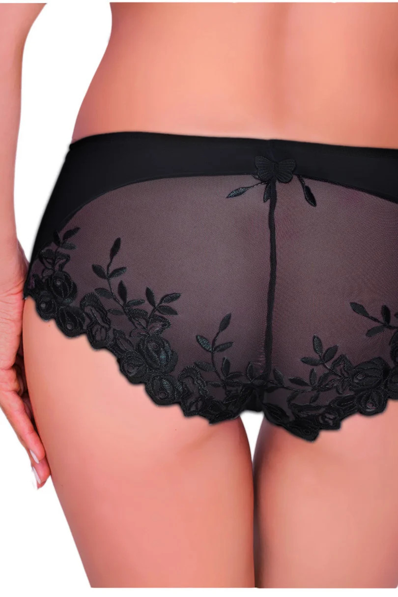 Dámské šortkové kalhotky z jemného mikrovlákna, boky i pozadí je ze síťky s efektními výšivkami.