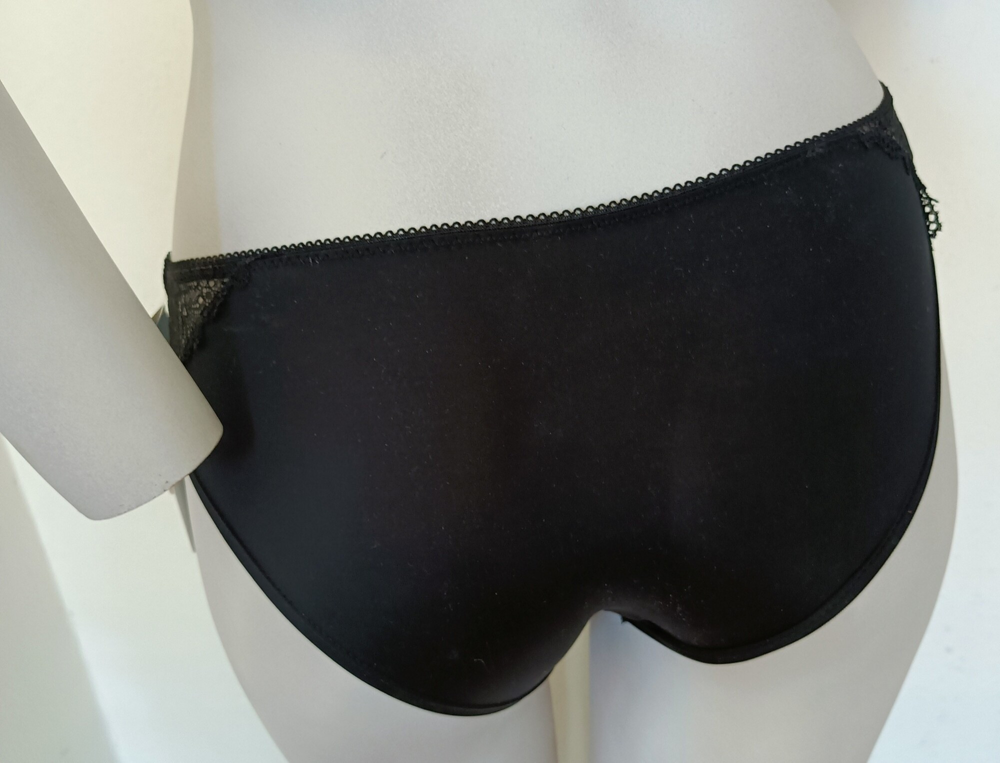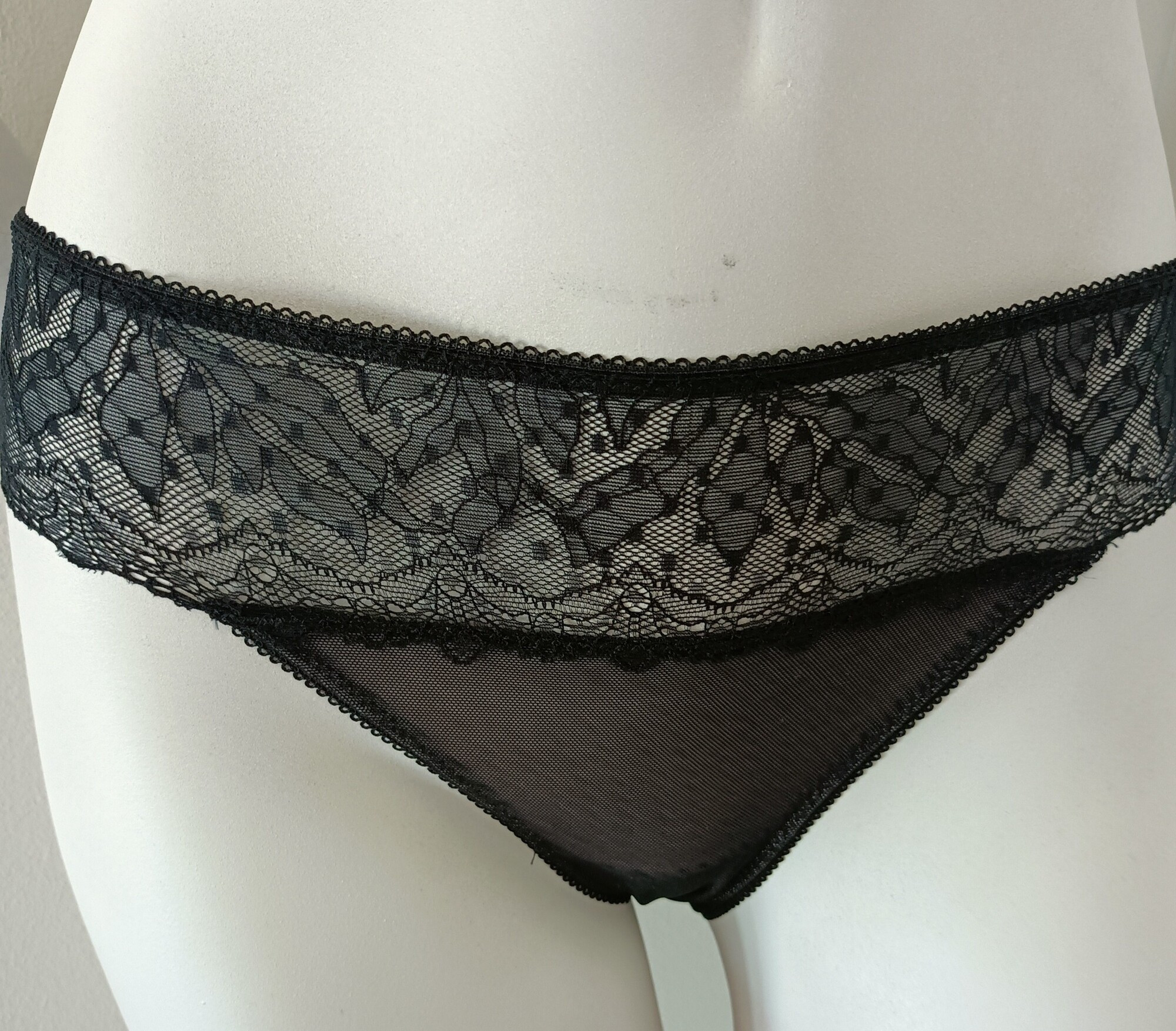 Klasické černé kalhotky, které jsou tentokrát doplněny širokým krajkovým lemem. Jako sexy pásek zdobí boky a vypadá obzvlášť smyslně. Linie hýždí je také zabalená do krajky. Spodní část spodního prádla je mírně průhledná, aby podněcovala představivost.