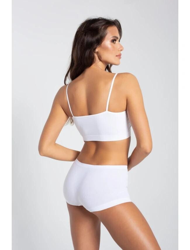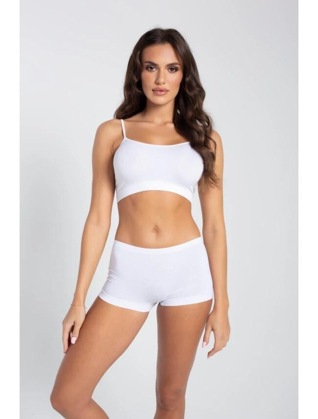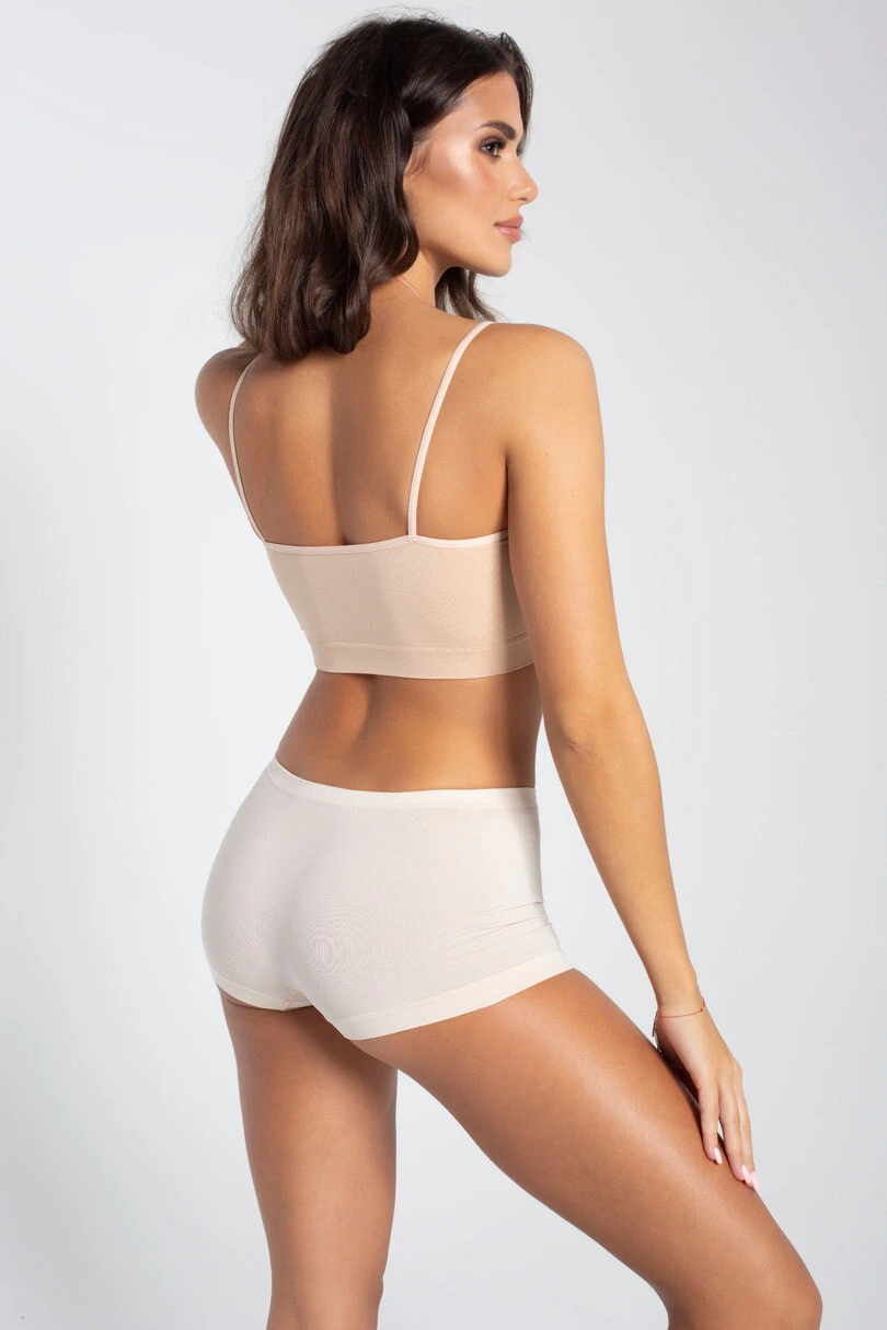 Bezešvé dámské kalhotky - šortky, které jsou vyrobené z jemné a prodyšné bavlny. Kalhotky mají ploché okraje. Model při nošení netlačí a nerýsuje se pod oblečením. Pas je olemovaný jemným stahovacím lemem. Kalhotky se ideálně přizpůsobují tělu, jsou vypasované a při nošení velmi pohodlné.