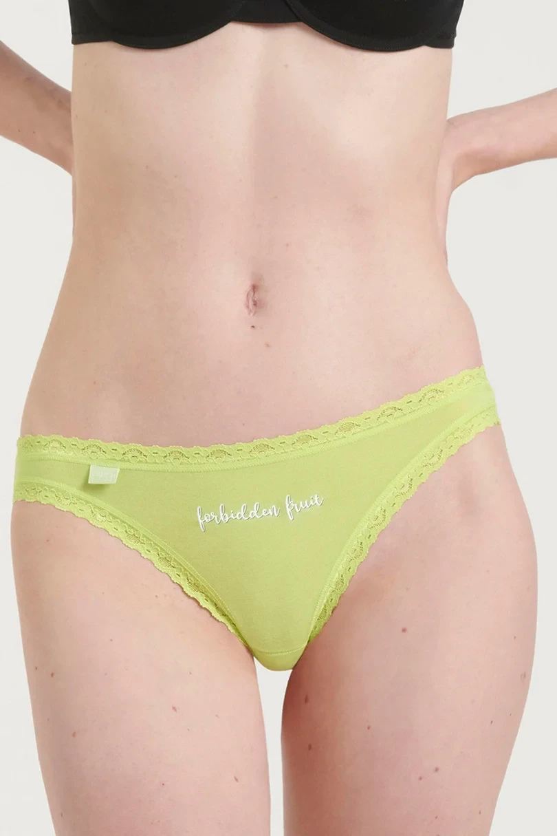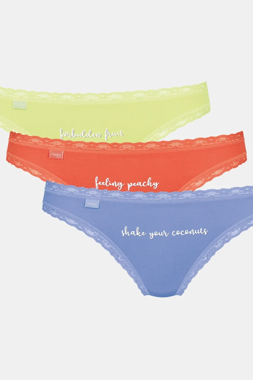 Dámské bavlněné bikiny zakončené jemnou krajkou.Balení po 3 kusech ve vyobrazených barvách.