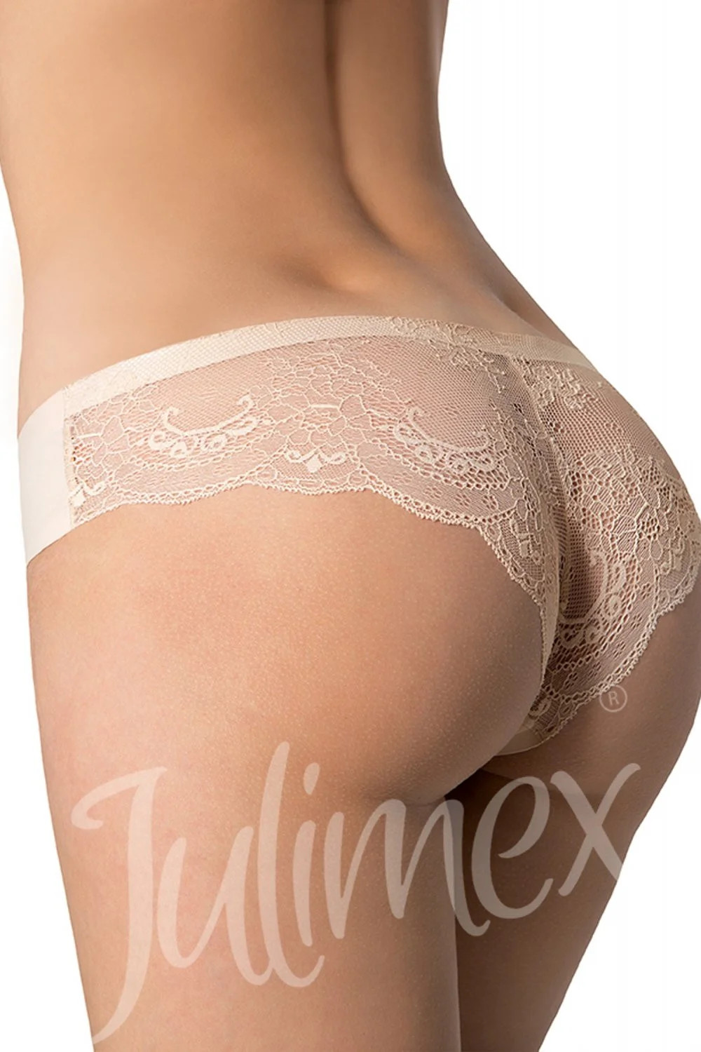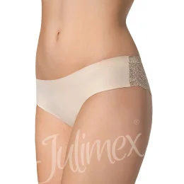 Dámské kalhotky Tanga Julimex - béžová barva - brazilský střih, odhalují zadeček - zdobené jemnou krajkou - svůdný designMateriálové složení: 89% polyamid +10% elastan + 1% bavlna