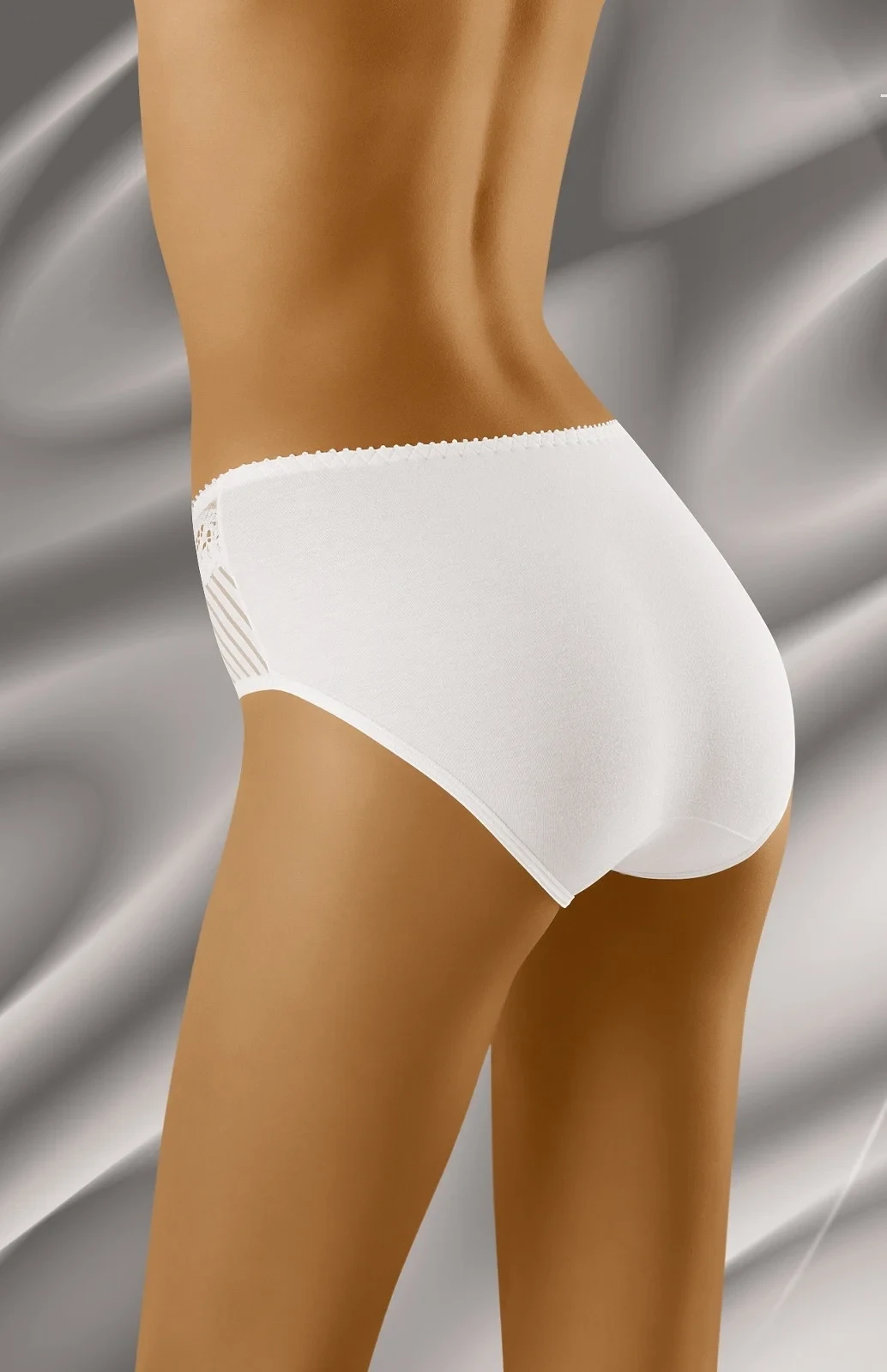 Kalhotky jsou ve přední části ozdobené krajkovými vsadkami. Zadní díl modelu je hladký.