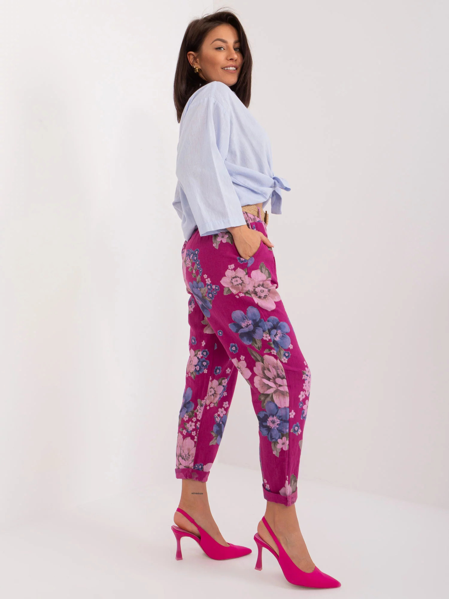 Produkt Dámské kalhoty DHJ SP 1365.89 Fialová s květy - FPrice prodáváme v těchto velikostech: one sizea barvách fialová vzor2016103526321
