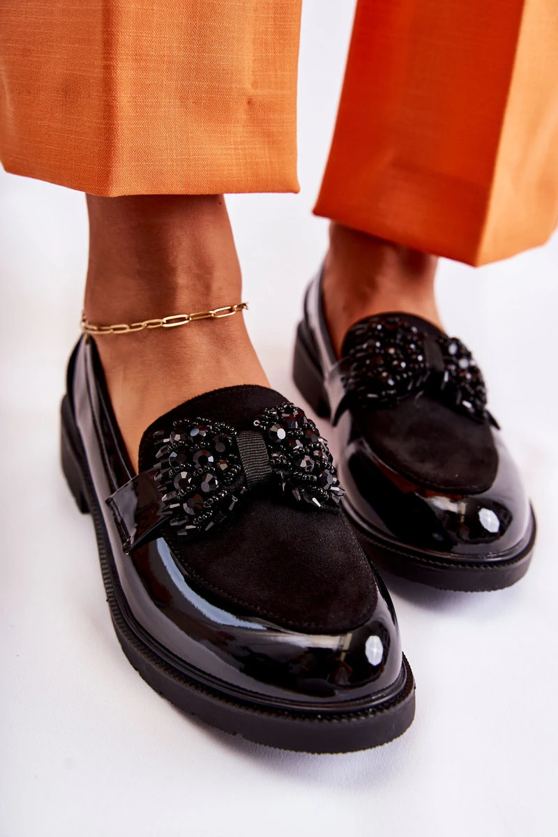 Elegantní dámské boty mají na pásku připevněnou ozdobnou mašličku s korálky. Boty jsou vyrobeny z lakované eko kůže s důrazem na každý detail s přídavkem eko semiše. Nasazené na plochém podpatku s protiskluzovou podrážkou. Pohodlí při používání zajistí stélka z eko kůže. Rozhodně byste je měli mít! Při výběru velikosti použijte tabulku velikostí.