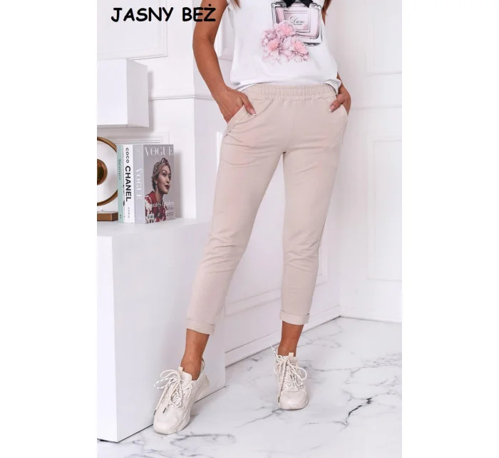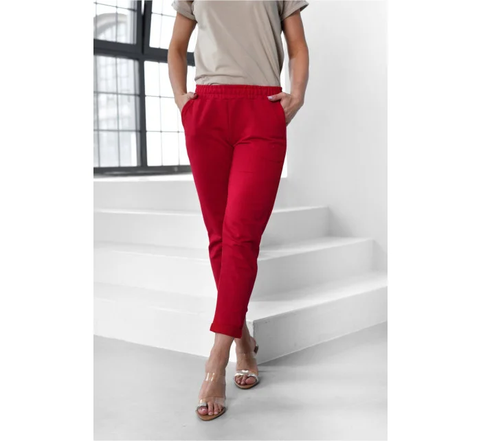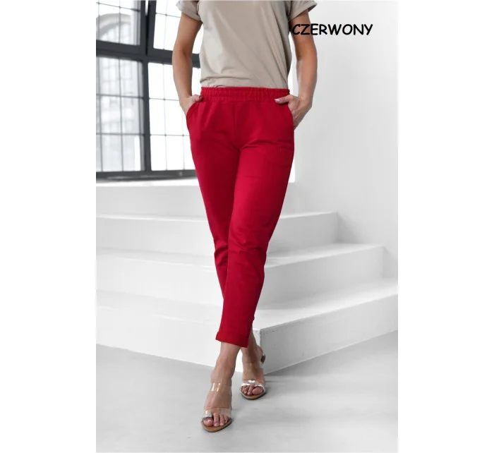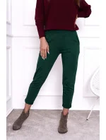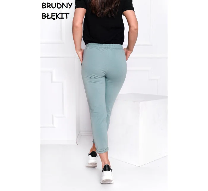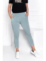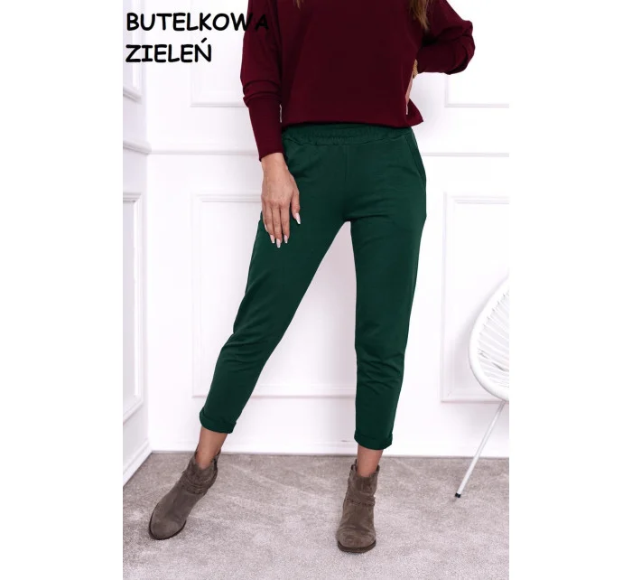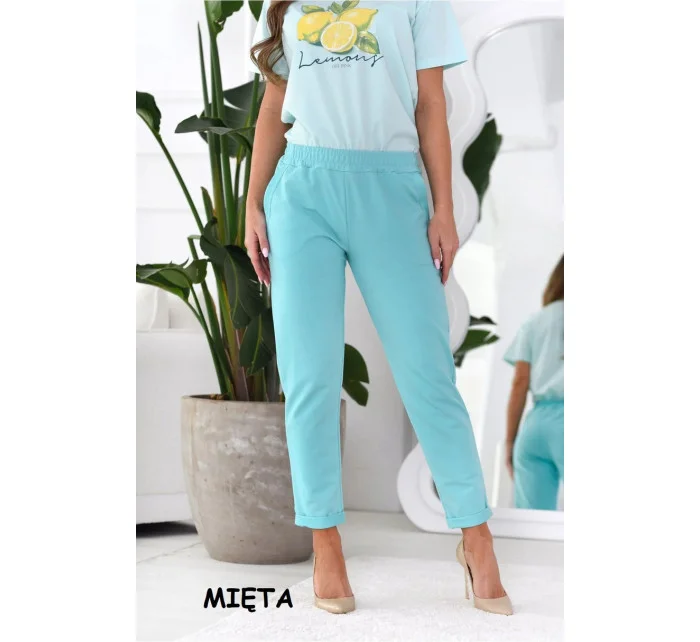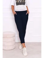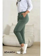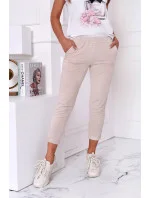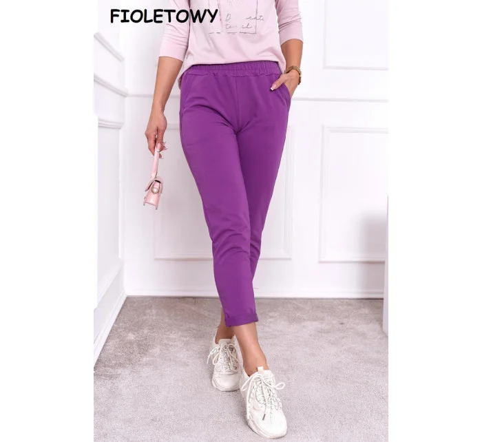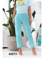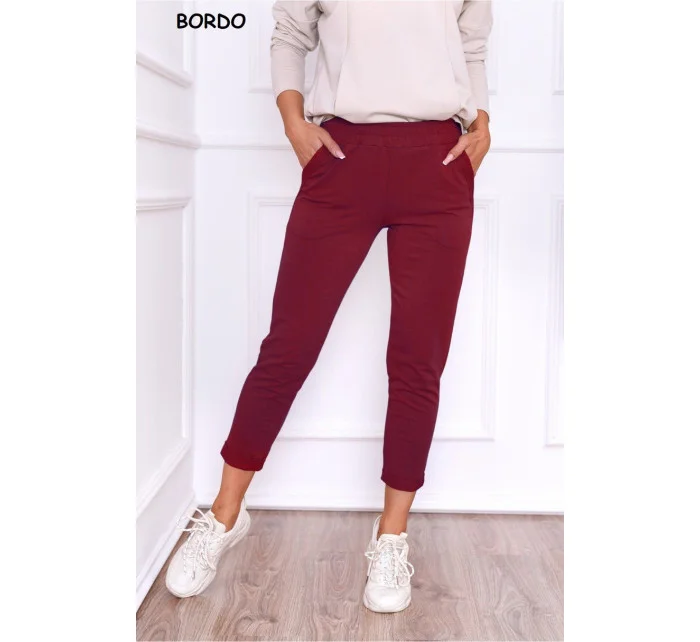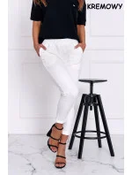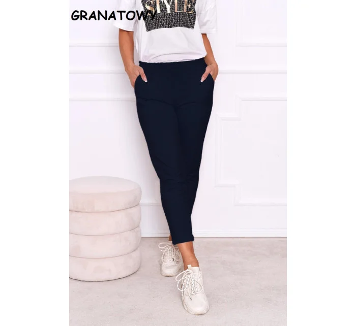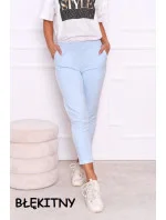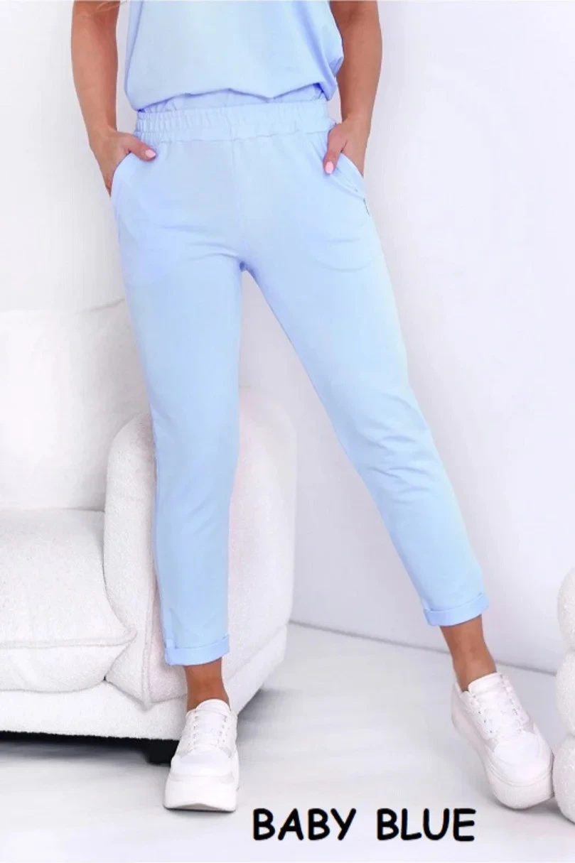 Kalhoty mají nohavice v 7/8 délce. Spodní okraj nohavic je ohrnutý. Ve přední části modelu jsou dvě kapsy. Zadní díl kalhot je hladký.