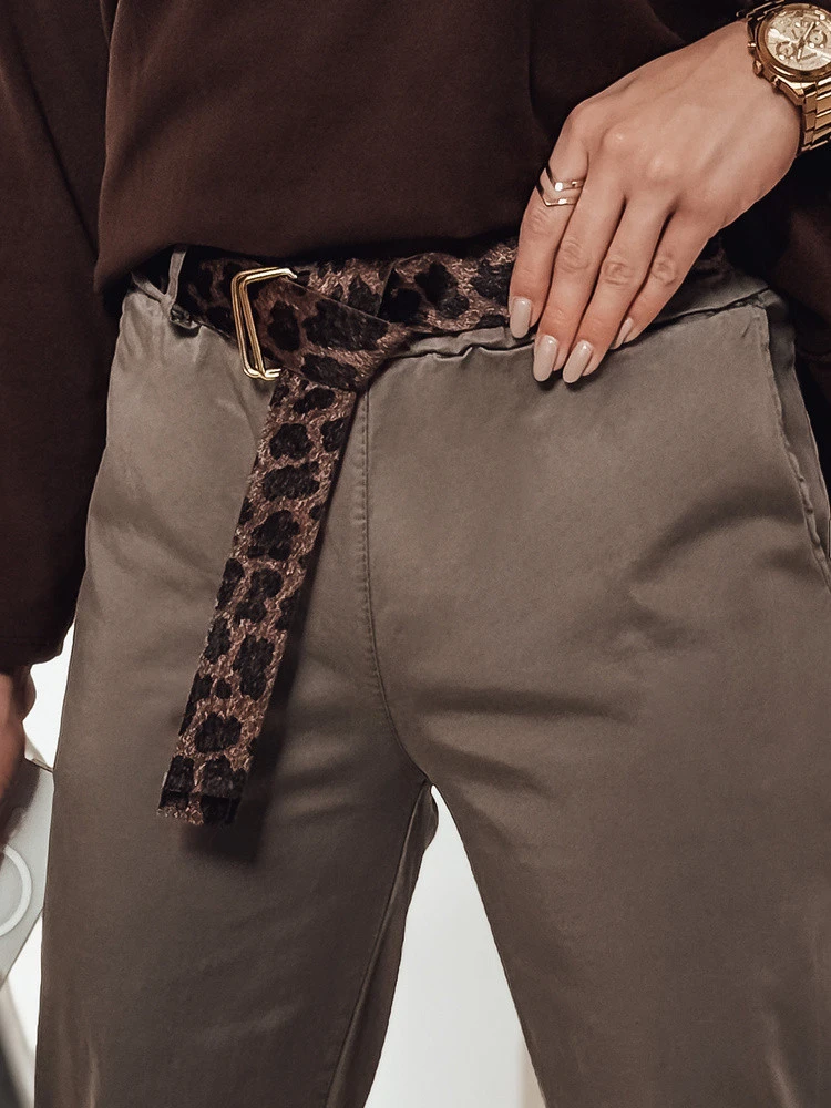 Stylové chino kalhoty s vysokým pasem, ideální pro ležérní outfity. Mírně zúžené nohavice zajišťují elegantní vzhled, zatímco přiložený pásek se zvířecím motivem dodává charakter. Kalhoty jsou ideální pro každý den i večerní vycházky.