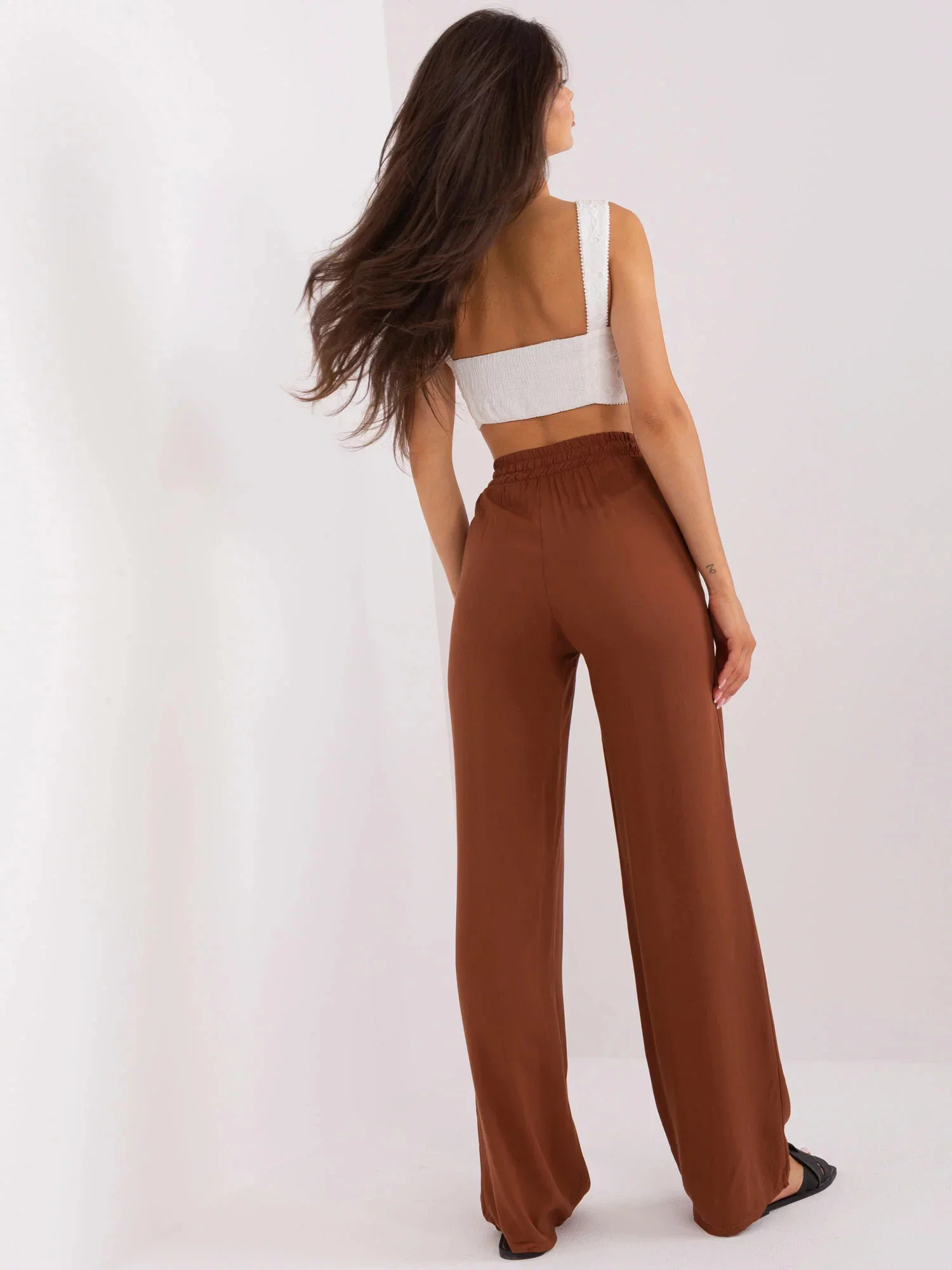 Hnědé látkové kalhoty s vysokým pasem .